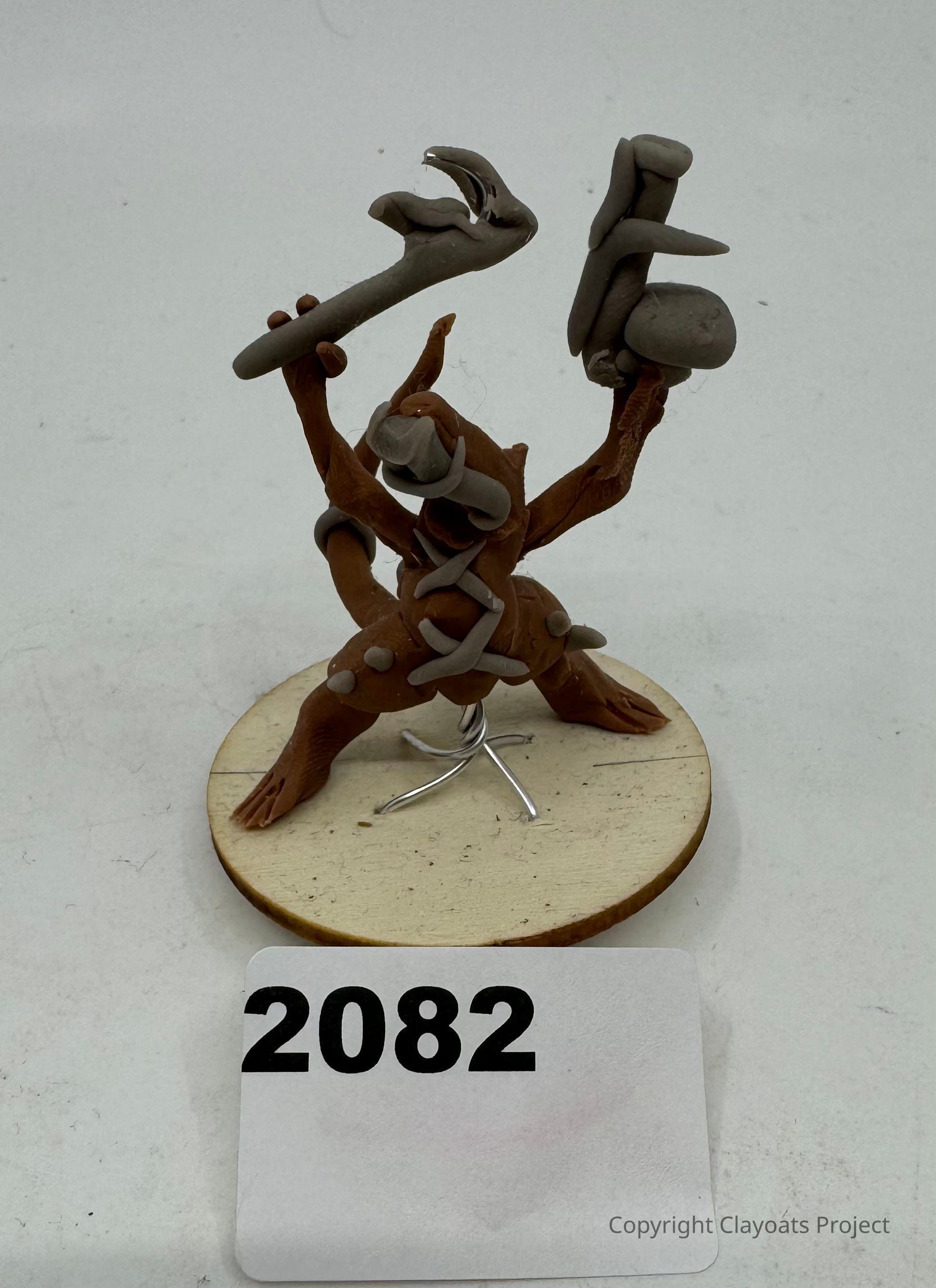 The image depicts a small, hand-crafted clay figurine of a creature with a humanoid form, standing on a circular wooden base, and holding two abstract instruments or tools aloft in each hand; its surface is adorned with various small organic shapes, and a wire structure supports it from beneath.