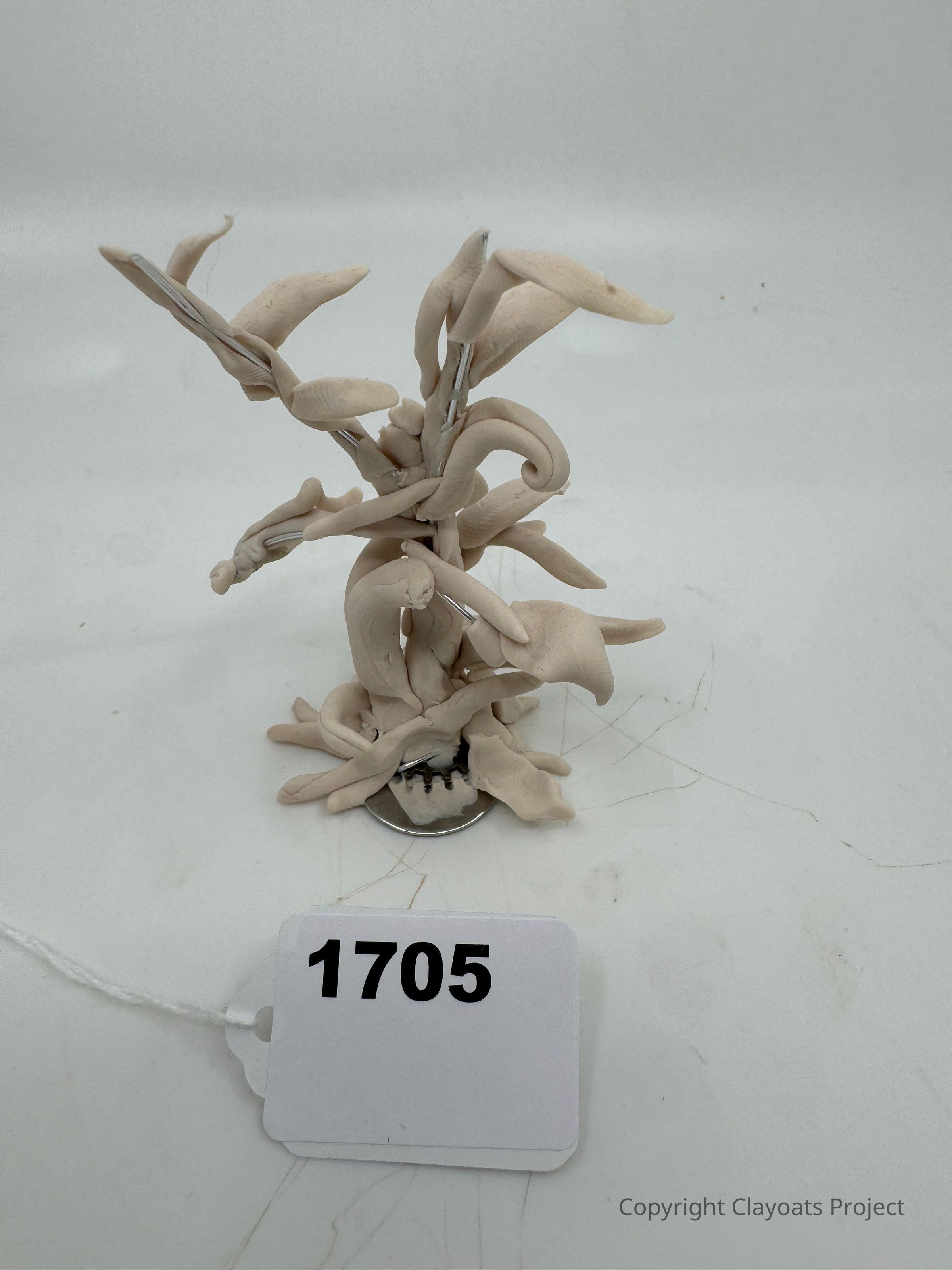 The image depicts an intricate, abstract sculpture made of a light-colored material, resembling clay, intricately shaped into flowing, organic forms that branch out in various directions. The sculpture's design suggests movement, with an almost plant-like appearance, and the clean, white backdrop highlights its delicate details and craftsmanship. The overall composition conveys a sense of both stability and dynamic motion, ev