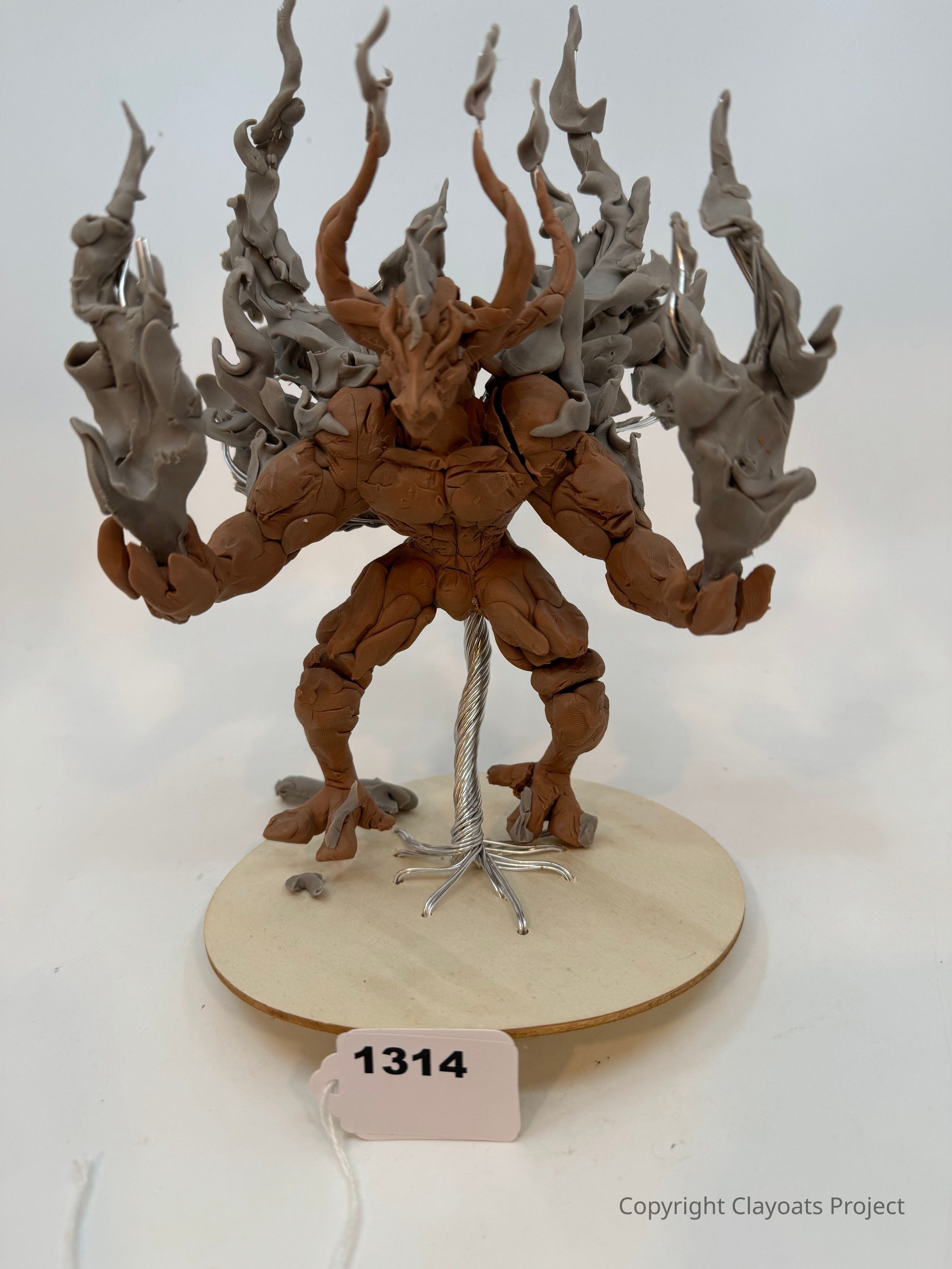 The image depicts a detailed clay sculpture of a fantastical creature standing on a round wooden base, The creature has a muscular brown body with large arms, tree-like legs, and intricate branches or flames extending from its back and arms, giving it a dynamic and mystical appearance, reminiscent of a forest spirit or elemental being. The texture of the clay is carefully crafted to show depth and movement, enhancing its lifelike quality while maintaining an aura of fantasy and otherworldliness