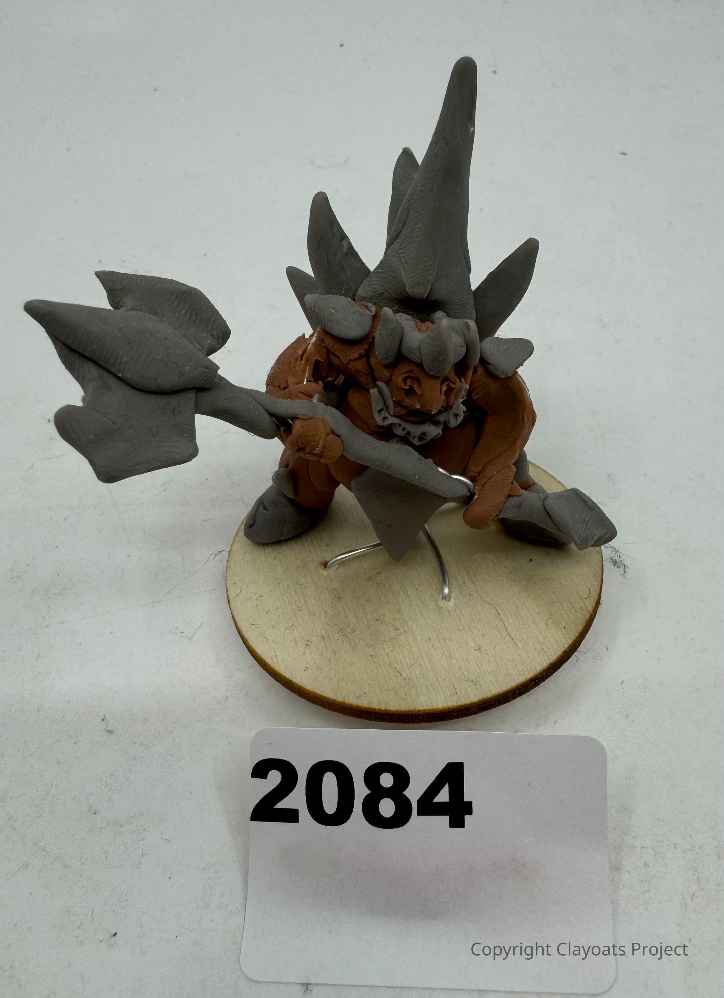 The image depicts a handmade clay figure with a menacing appearance, crouched on a wooden base, featuring spiky gray armor and wielding a large weapon, showcasing intricate details and a dynamic pose; with the entire setup against a neutral background that highlights the figure's craftsmanship and artistic design.