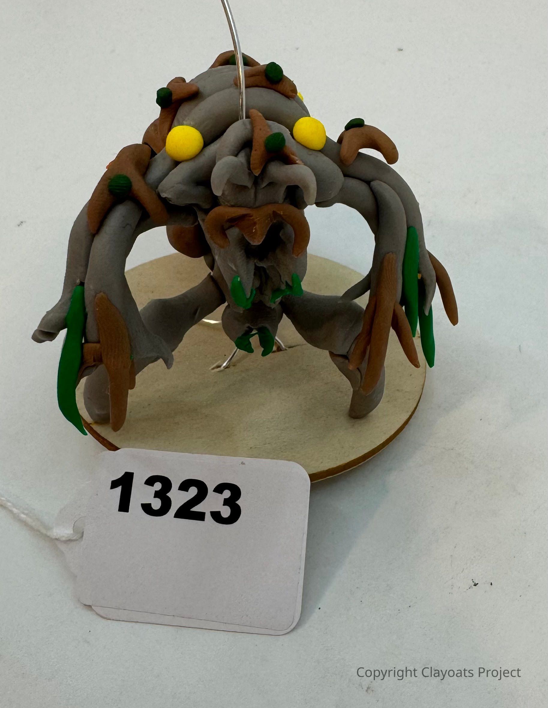 The image depicts a creative sculptural figure made of clay, featuring a gray base accented with brown and green elements, giving it an organic, mythical appearance; it has yellow protrusions resembling eyes and is mounted on a round wooden stand.