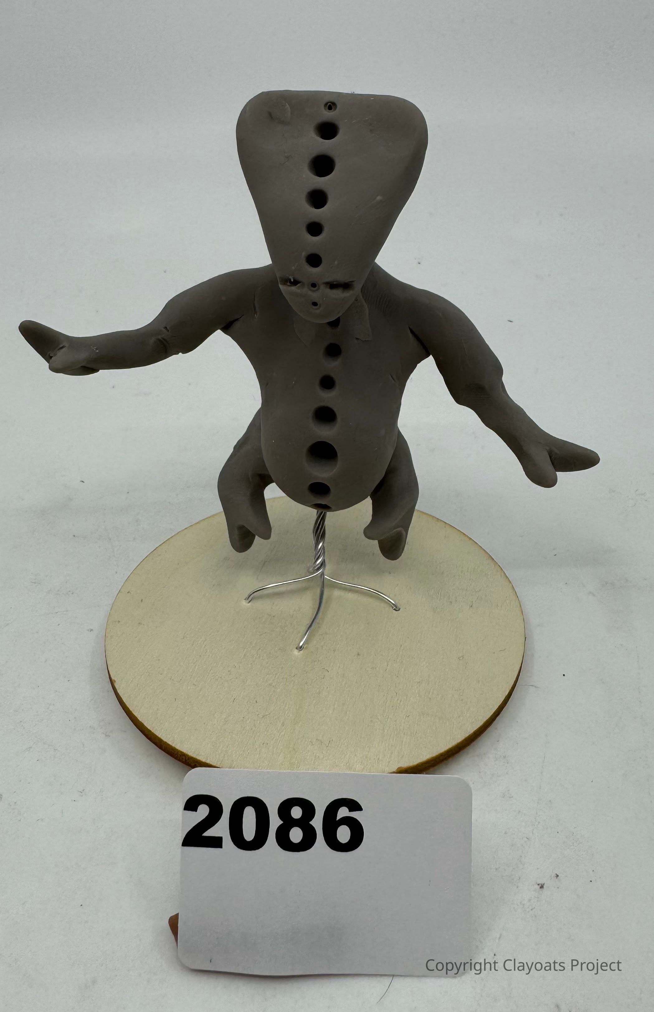 The image shows a whimsical, abstract clay figure with a triangular head featuring a vertical row of circular holes down its center, positioned on a circular wooden base, supported by a simple wire stand.