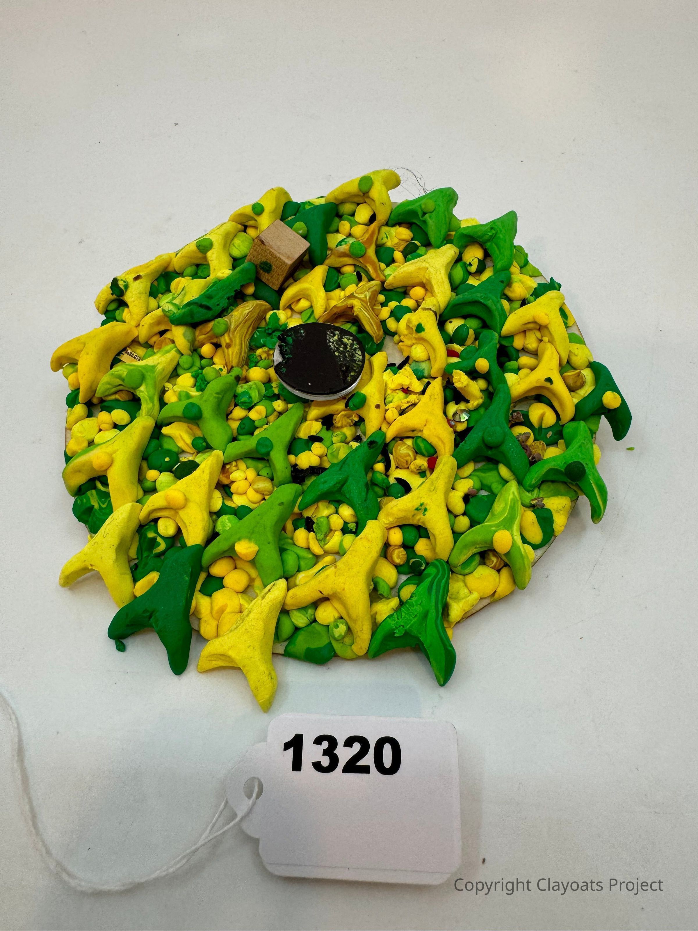 The image shows a round, textured, and colorful craft piece made from green and yellow clay, featuring various abstract, organic shapes and small wooden cubes scattered throughout, with a central circular black and white reflective element. The entire structure is placed on a white surface, drawing attention to its vibrant hues and intricate design.