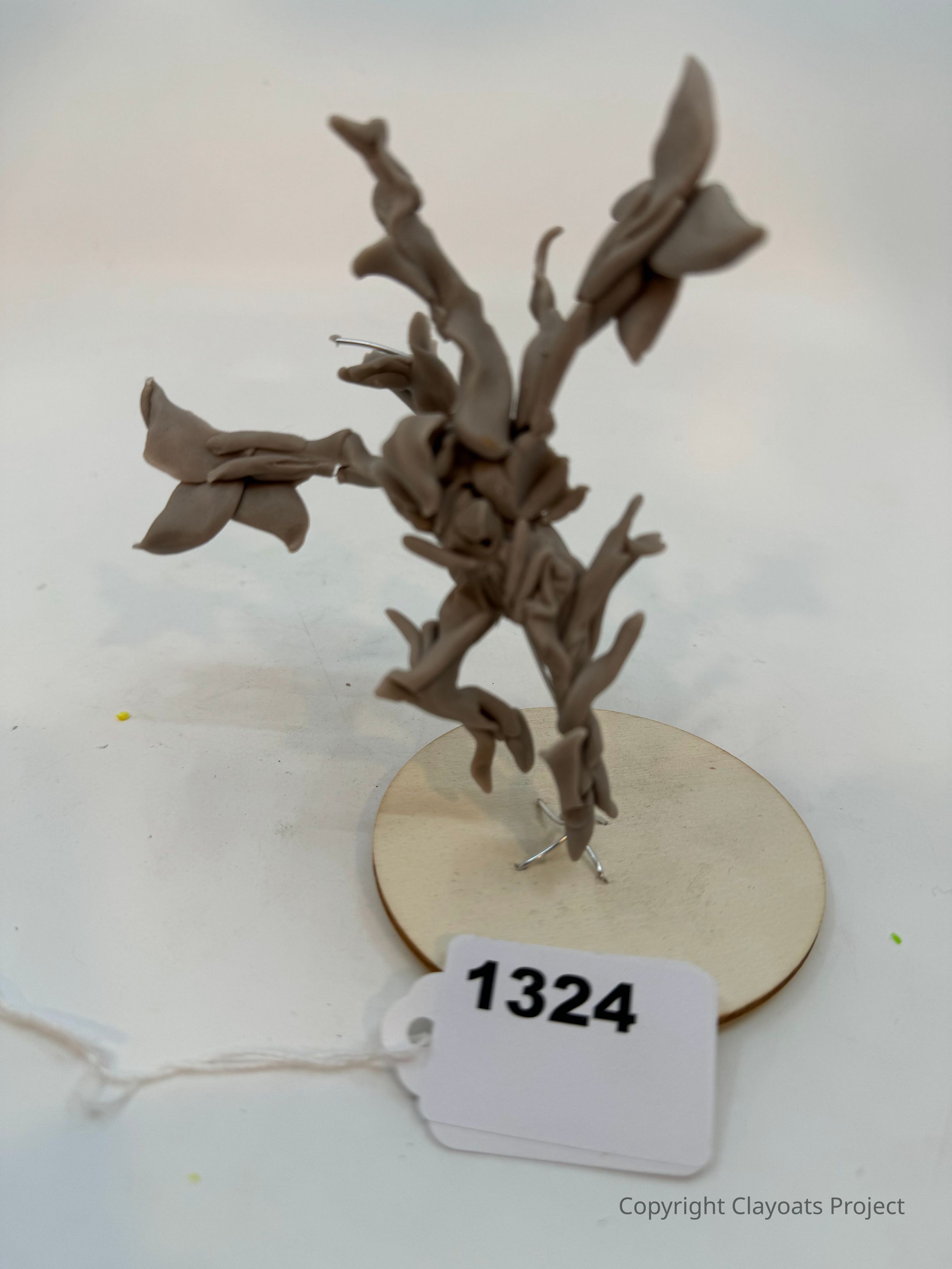 The image displays a small sculpture crafted from a material resembling clay, fashioned into an abstract form with multiple protruding elements, mounted on a circular wooden base. . The backdrop provides a neutral, soft illumination that accentuates the details in the sculpture's texture and shape, creating a visually intriguing contrast between the artwork and its background.