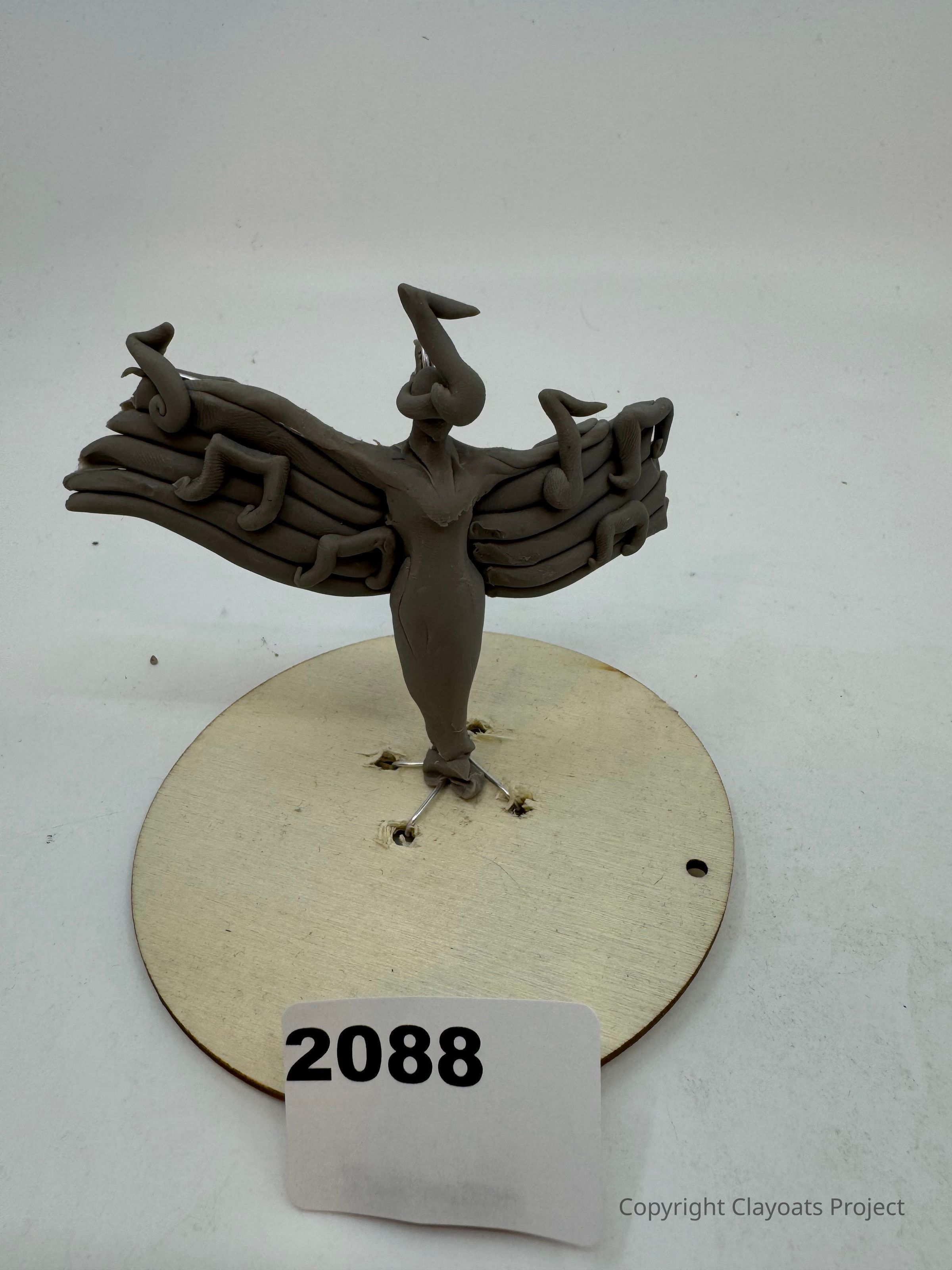 The image depicts a clay sculpture resembling a bird with wings spread wide, adorned with flowing musical notes, mounted on a circular wooden base. The sculpture, which has a stylized and abstract design, features intricately coiled notes that give an impression of movement and harmony. The background is plain and unobtrusive, allowing the details of the sculpture
