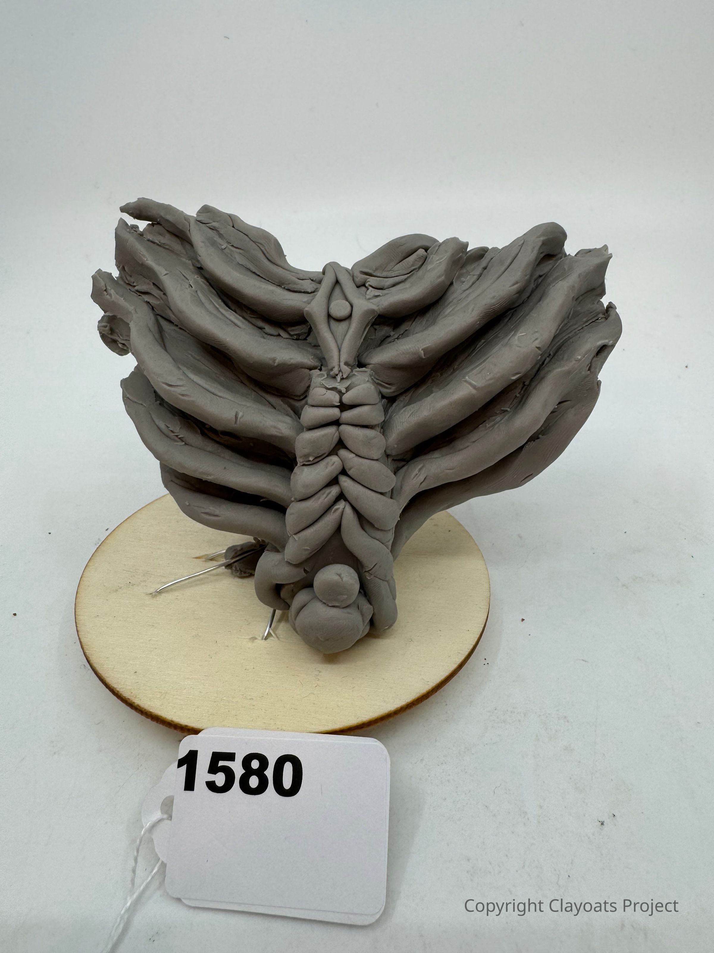The image shows a sculpted model resembling a ribcage made from gray clay, placed on a circular wooden base. The intricately molded structure displays several rib-like appendages, intricately layered with a central spine-like component, giving it a skeletal appearance. The background is plain and light, allowing the clay figure to be the focal point, highlighting its detailed craftsmanship and artistic resemblance to an