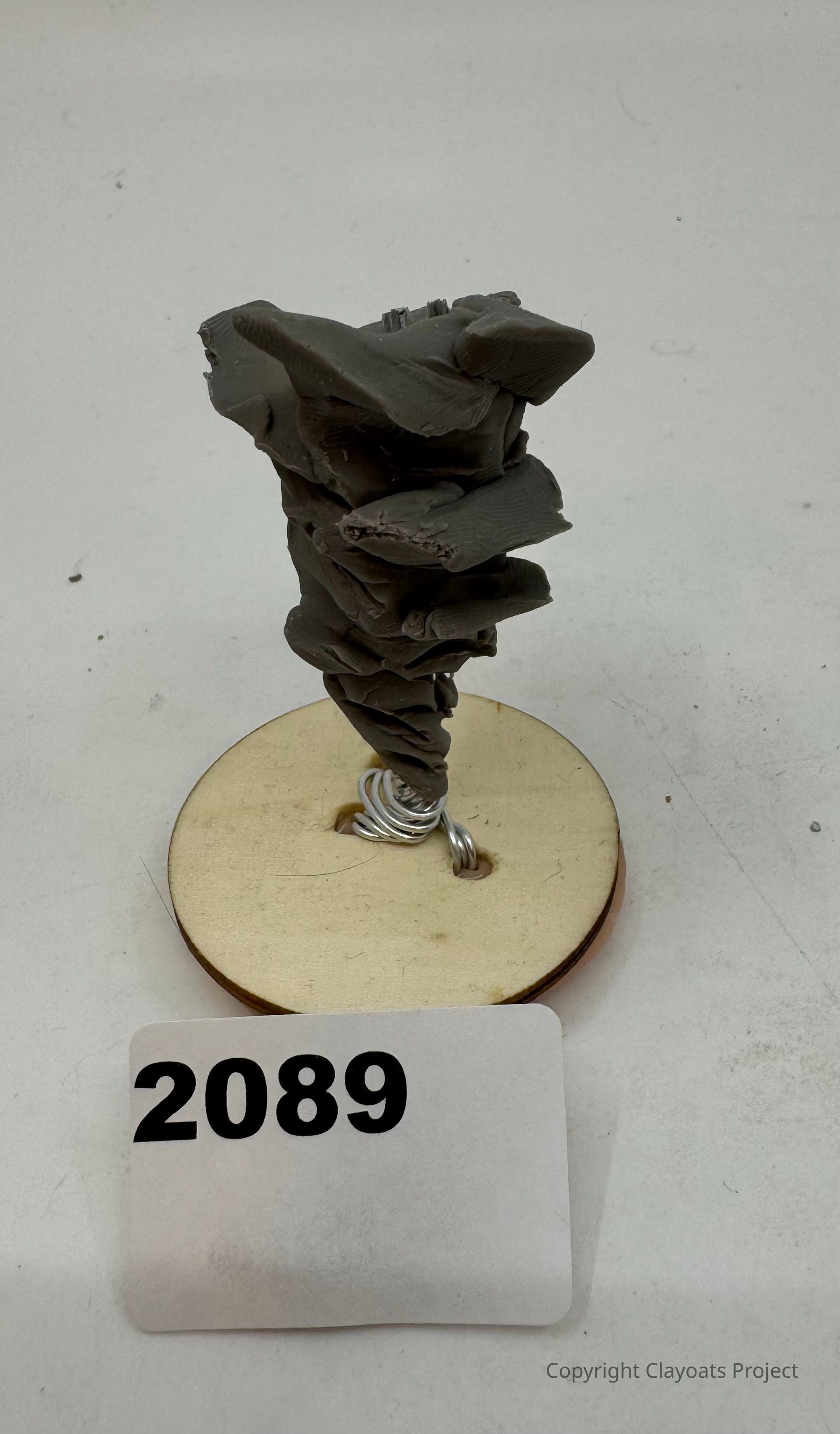 The image showcases a sculptural piece with a stacked formation of irregular gray clay pieces, mounted on a circular wooden base with a coiled wire support, capturing a sense of abstract art and creative expression.