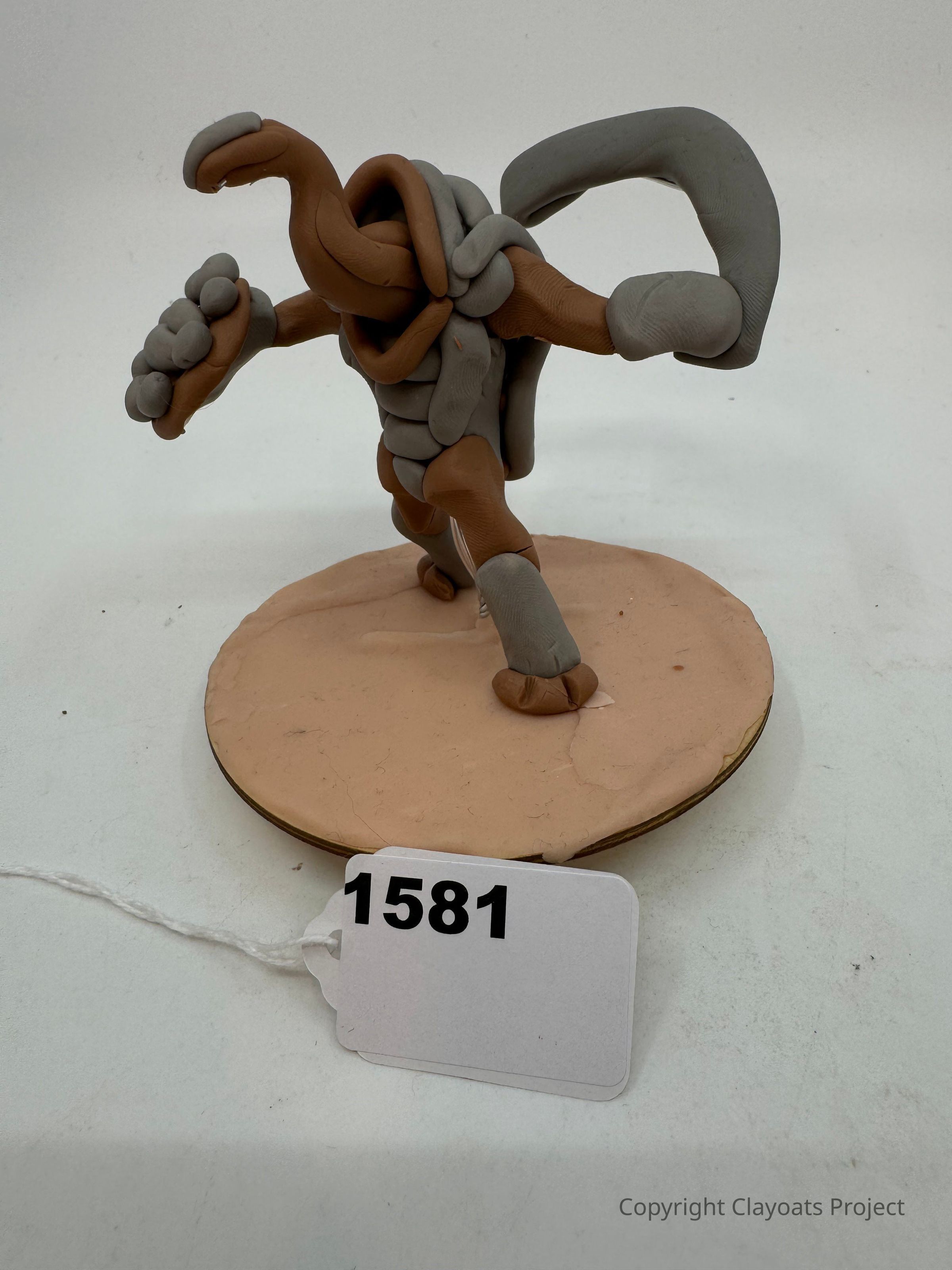 The image depicts a clay sculpture of a humanoid figure with abstract features, combining brown and gray colors, posed dynamically on a circular base; resting in front of the sculpture, highlighting its unique design in a simplistic setting.