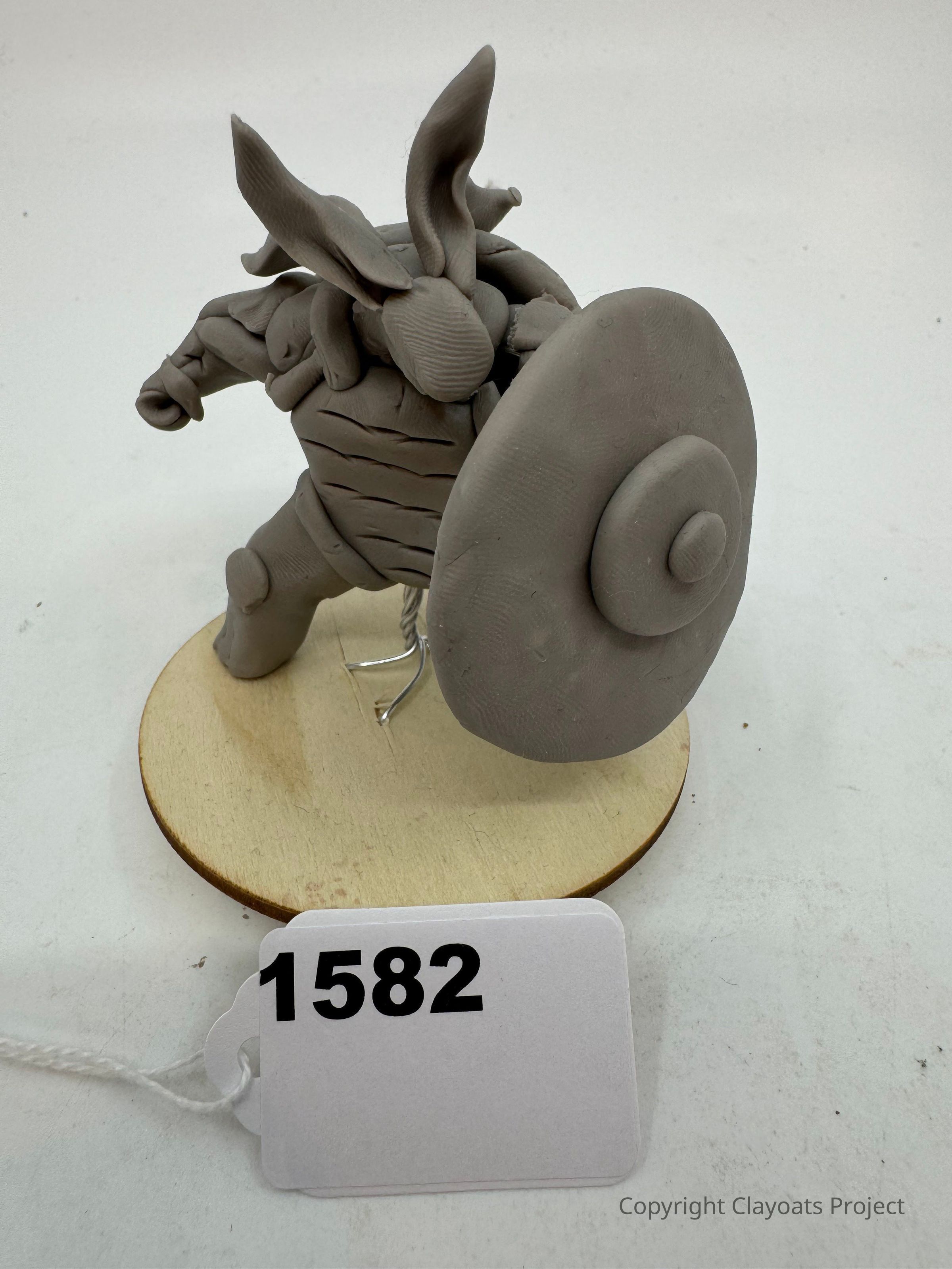 The image shows a clay sculpture of a warrior-like figure with elongated ears, stood on a circular wooden base. The figure is posed in a dynamic stance, holding a large shield in one hand, suggesting a scene of combat or defense. The clay appears unpainted, with visible textures and markings giving the sculpture a handmade feel.