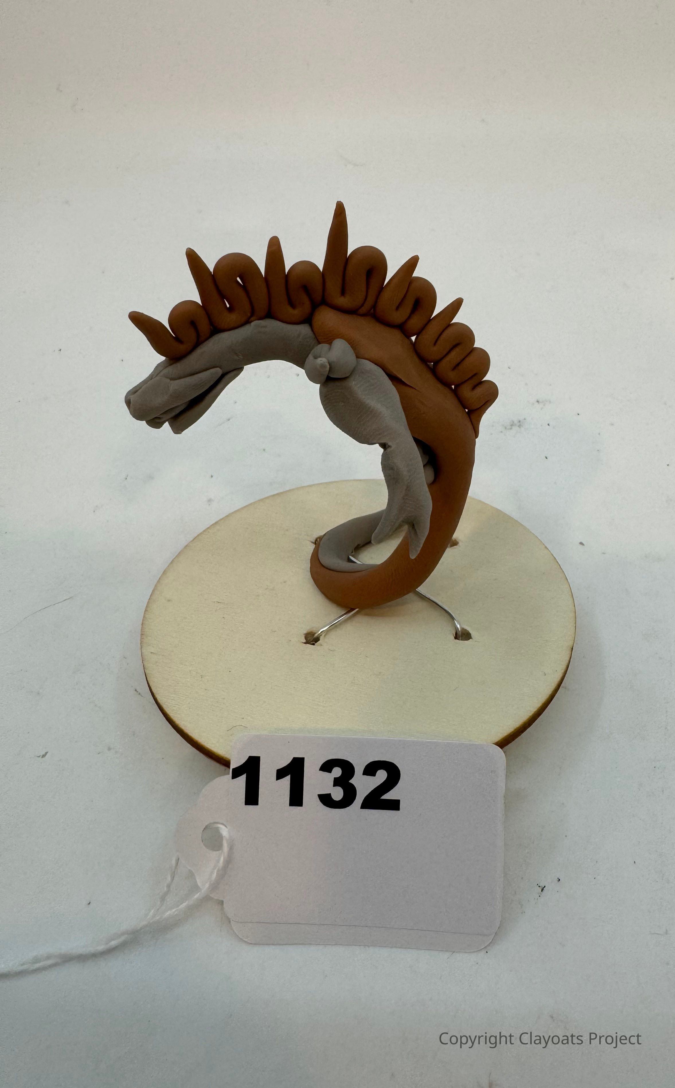 The image features a small, intricate sculpture resembling a stylized dragon or sea creature with brown and gray tones, curled upwards in a circular motion, and displaying spiraled spikes along its back, all set against a simple white background; it is mounted on a round, flat base with thin metallic supports.