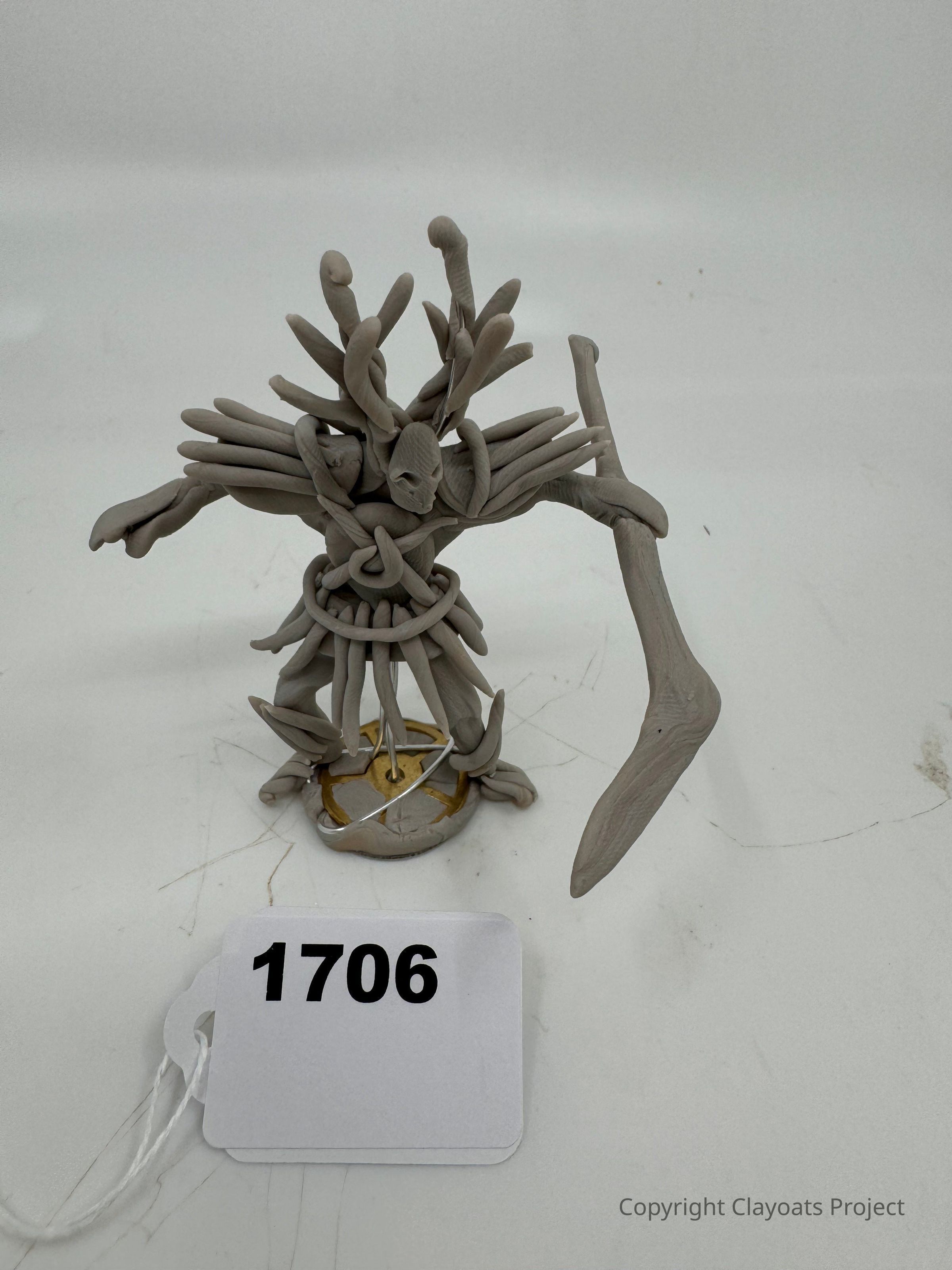 The image features a small sculpted figure made of clay, shaped into a fantastical creature with branch-like protrusions extending from its body, standing on a circular base with an arrow design;.