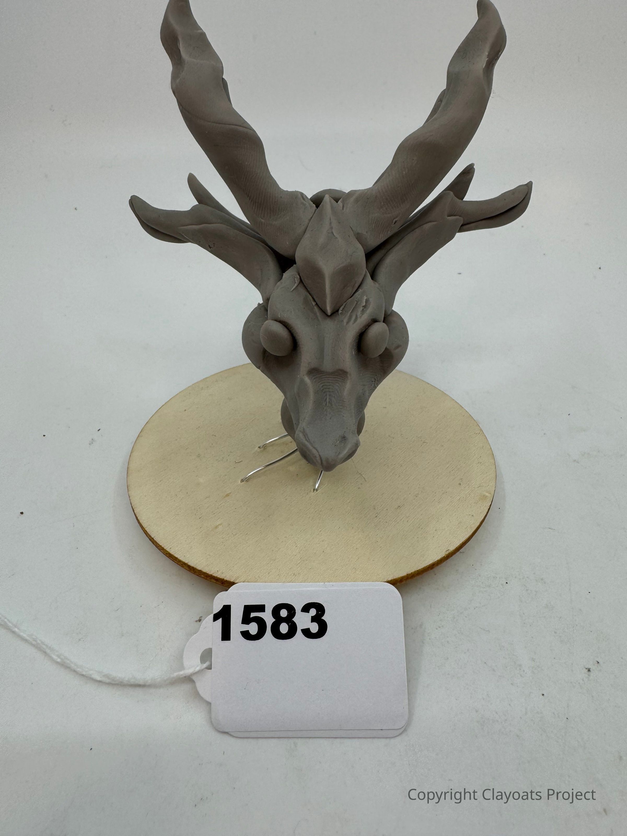 The image showcases a gray sculpture of a fantastical creature with large, twisting horns and prominent eyes, mounted on a round wooden base.
