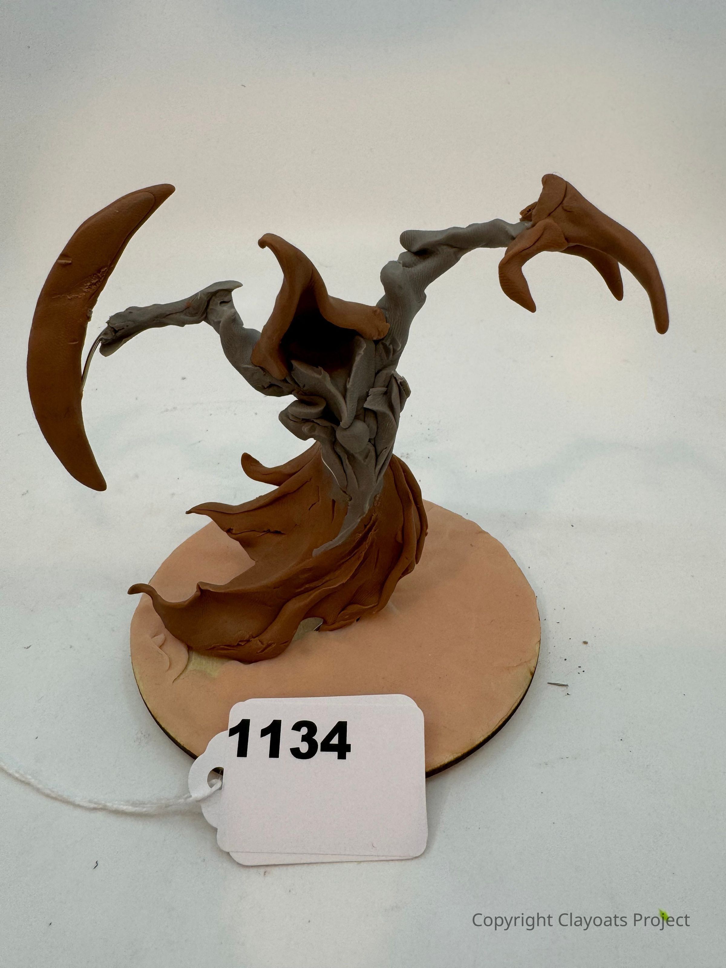 The image displays a sculptural figure made of clay, featuring a swirling, abstract form with flowing, elongated shapes that resemble arms or branches, each ending in pointed, claw-like extensions. The sculpture is mounted on a round base, resting on a flat surface, . The overall color palette includes earthy tones, such as reddish-brown and gray, giving the piece an organic yet fantastical appearance, reminiscent of a mythical or otherworld creature.