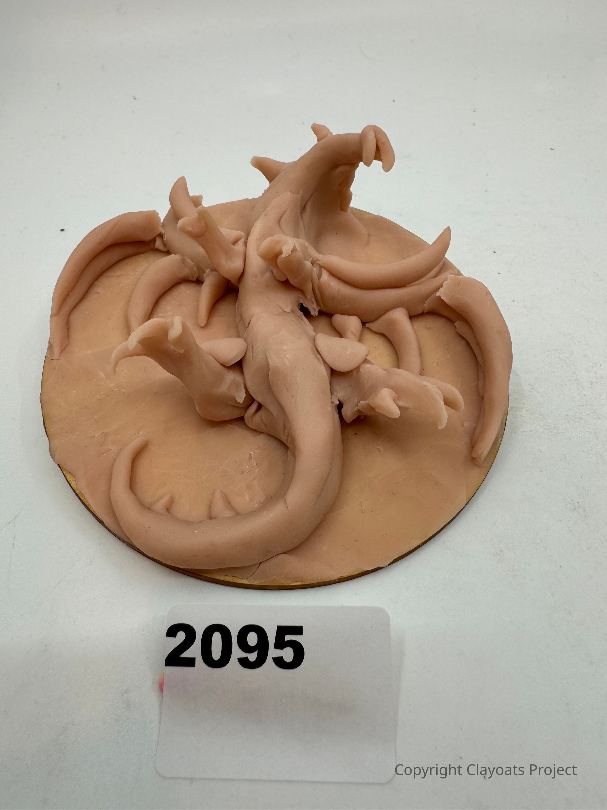 The image features a complex, abstract sculpture made from a beige clay-like material, showcasing a circular base with multiple curved, tentacle-like appendages extending outward in various directions, resembling organic forms or mythical creatures. The intricate details of the sculpture emphasize undulating shapes and dramatic twists, adding to its dynamic appearance. The surface has a matte finish, highlighting the handcrafted quality of the piece. this