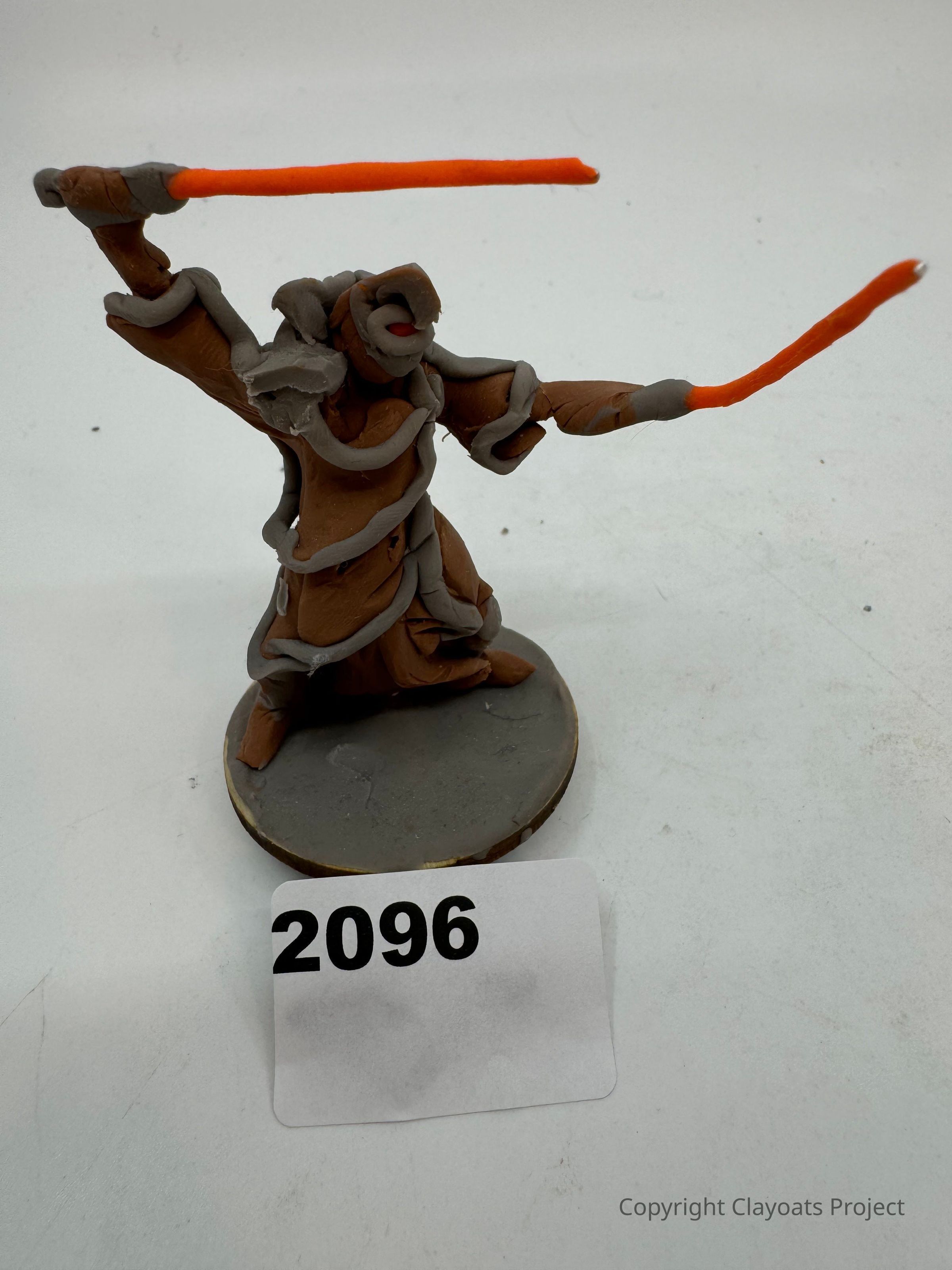 The image shows a clay figurine posed dynamically, wearing a cloak and holding two orange rods resembling lightsabers, representing a fictional warrior or sorcerer character. The figure stands on a circular base, and a piece of paper with the number 2096 is placed at the front. The character's intricate detailing includes a wrapped cloak and an abstract facial structure, suggesting a blend of fantasy elements. The color palette primarily consists of browns and grays, with the bright orange rods providing a vivid