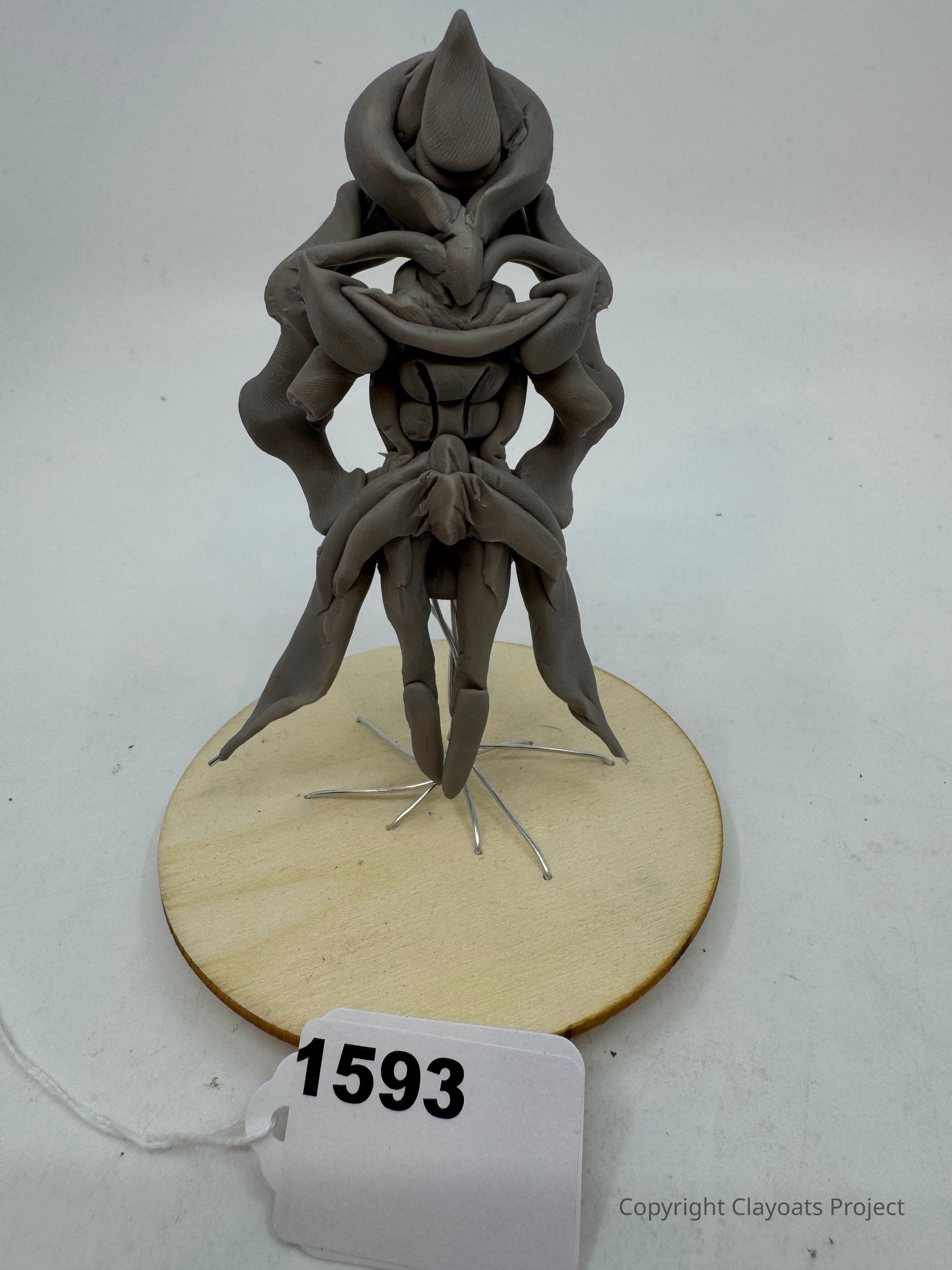 The image shows a complex sculpture made of gray material, possibly clay, featuring abstract, organic shapes that create a tall, symmetrical structure. It is mounted on a round wooden base, with metal wires extending around its lower part. The intricate design comprises interlocking, flowing forms, giving it a fluid and dynamic appearance, evoking a fusion of natural and surreal elements. In front of the base.