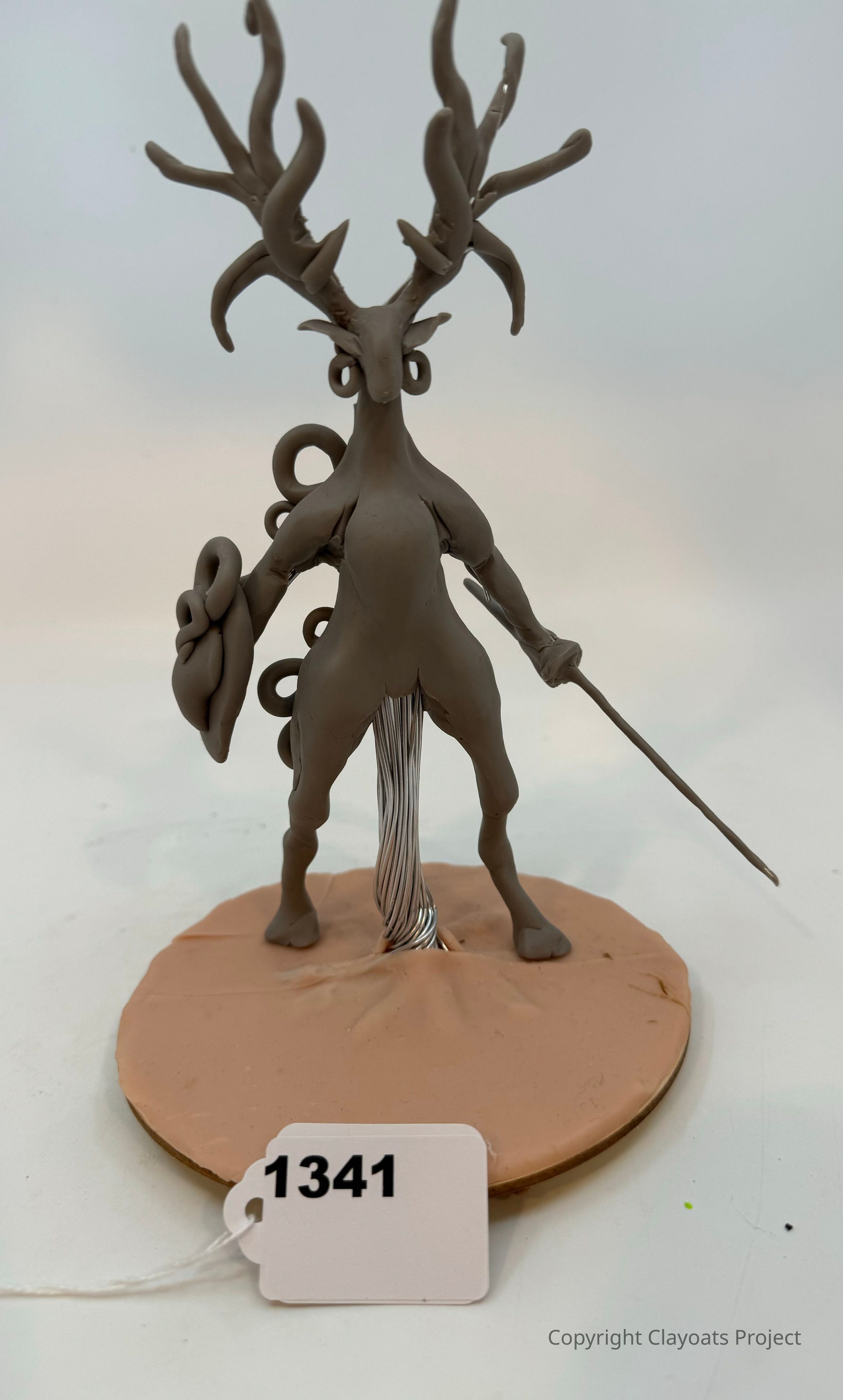 The image features a clay sculpture of a mythical creature with large, twisting antlers standing on a circular base. It appears to be holding a staff in one hand and a shield adorned with circular designs in the other. Its elongated limbs and intricate details add to its otherworldly appearance, evoking an ancient or mystical theme.