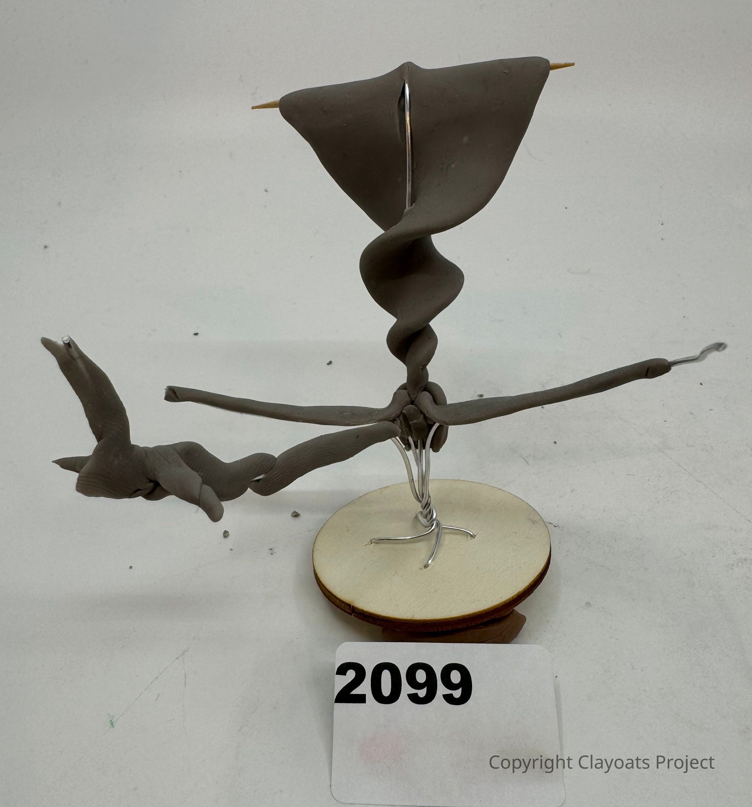 The image shows a sculptural piece made primarily from a dark gray, pliable material, likely clay, intricately twisted around a metal wire structure that forms an abstract shape resembling a bird or creature in motion. The sculpture is mounted on a round wooden base, with the number "2099" displayed on a piece of paper in front. This artistic creation captures a sense of dynamic movement and fluidity, drawing the viewer's attention to its expressive form and textured surface. The minimalist background enhances the sculpture