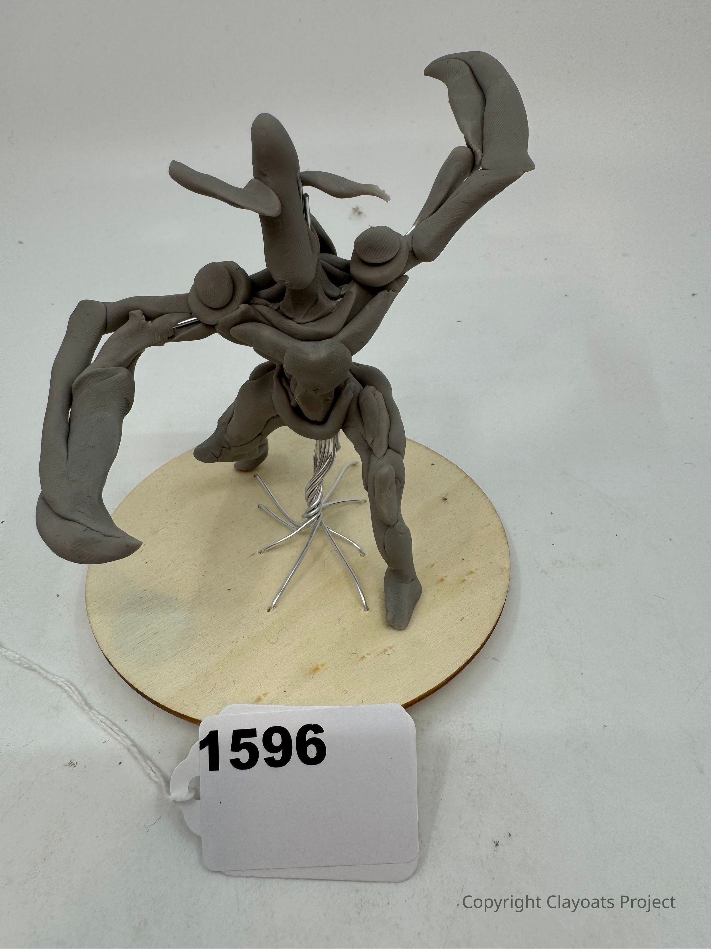 The image showcases a unique sculpture made of gray clay, resembling an abstract, multi-limbed creature with prominent claws, placed on a round wooden base with wire supports. The sculpture's creative design and dynamic pose give it an intriguing, artistic appeal.