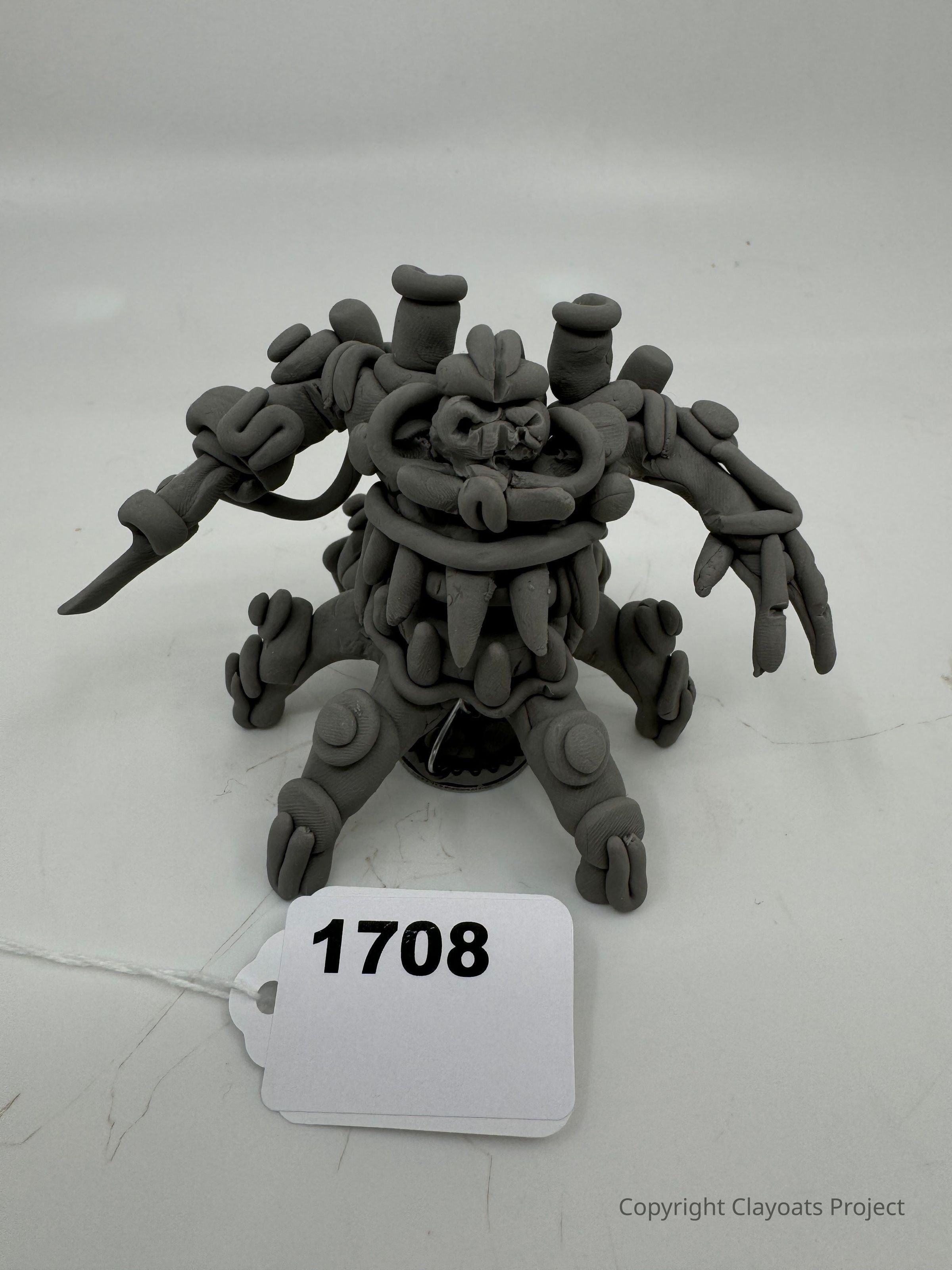 The image depicts a gray, intricately crafted clay sculpture of a fantastical creature, featuring multiple limbs and a menacing expression, adorned with various cylindrical and organic shapes, suggesting a fusion of mechanical and organic elements; it stands on a circular base.connected by a piece of string, all set against a neutral light background that emphasizes the sculpture's detailed textures and imaginative design.