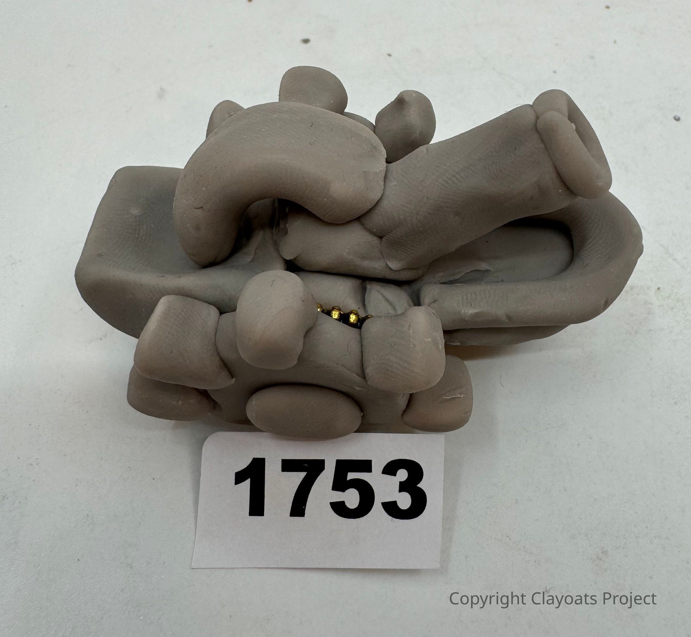 The image displays a gray clay sculpture consisting of various abstract, rounded shapes and curves, with a small, visible row of gold beads embedded within the structure; it is placed on a flat, white surface.