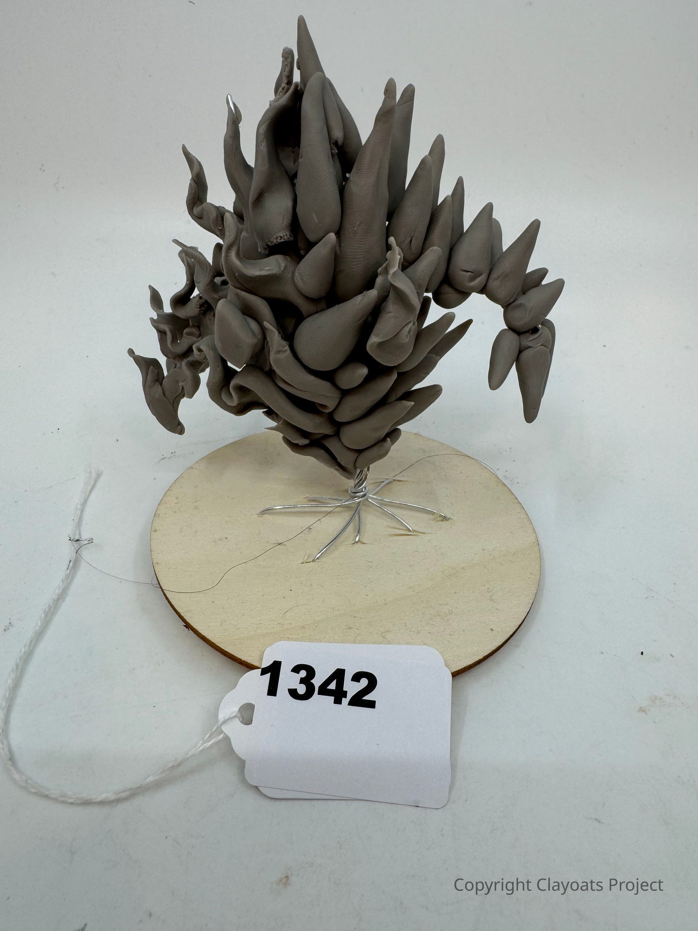The image shows a sculptural piece composed of numerous elongated, pointed, dark shapes assembled intricately atop a circular wooden base, which appears to be supported by a network of thin metal wires, and the sculpture, with an abstract and organic form, providing an intriguing and artistic display against a plain background.