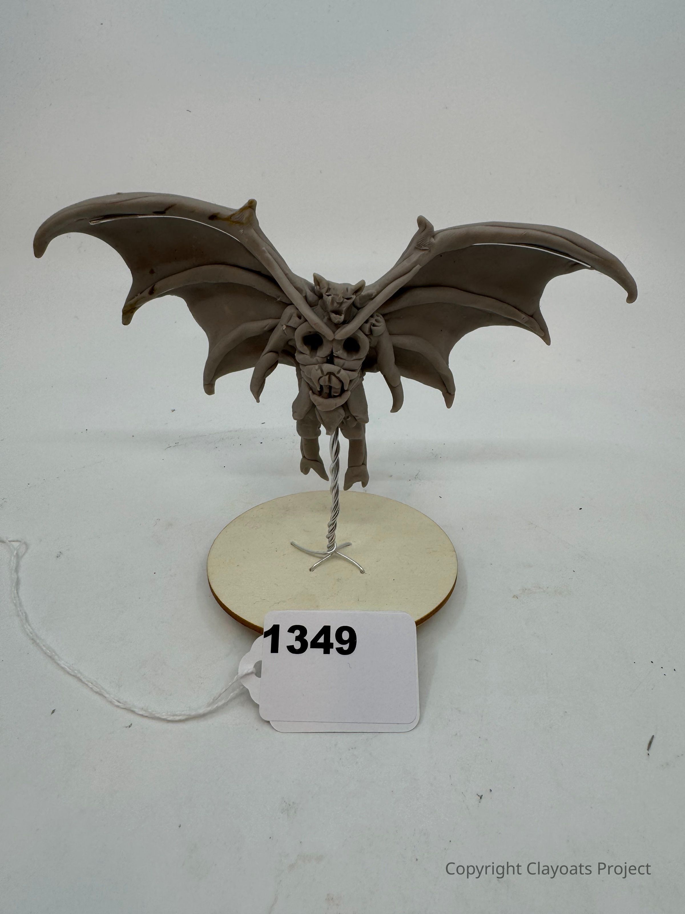 The image displays a detailed gargoyle figure with large, outstretched wings and a menacing expression, positioned in a dynamic pose. It is mounted on a round base with a twisted metal wire stand. The overall color tone is a neutral gray, highlighting the intricate details of the sculpture against a plain white backdrop.