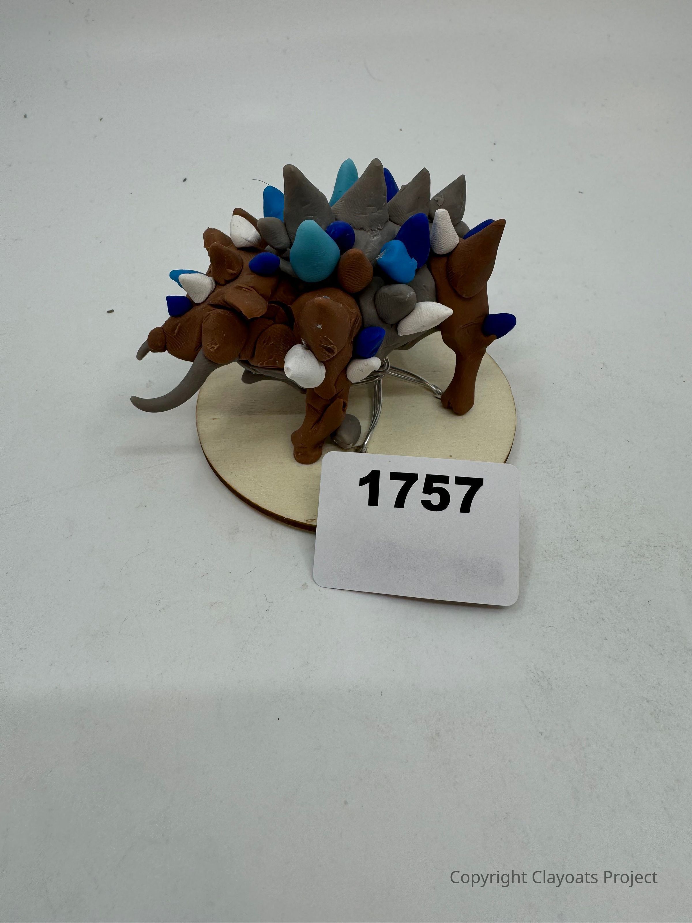 The image shows a handcrafted clay model of a dinosaur with multiple spikes on its back in shades of gray, blue, and white, displaying a variety of textures and colors, placed on a round wooden base with the number 1757 displayed on a small white card in front of it.
