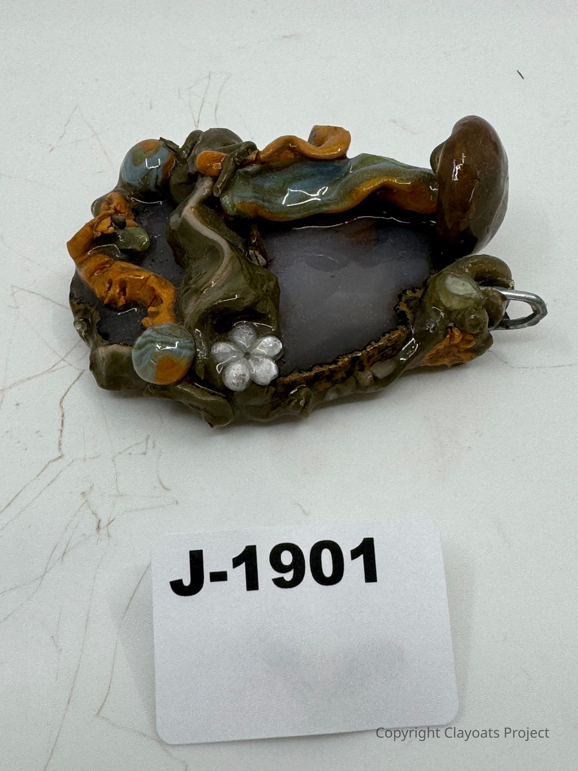 The image depicts a small, intricately designed object resembling a nature-inspired sculpture with earthy colors, featuring green, brown, and orange tones, along with shiny surfaces that give a glazed appearance. It includes fluid, organic shapes that mimic natural forms like rocks and foliage, with small glass-like spheres and a flower embellishment.
