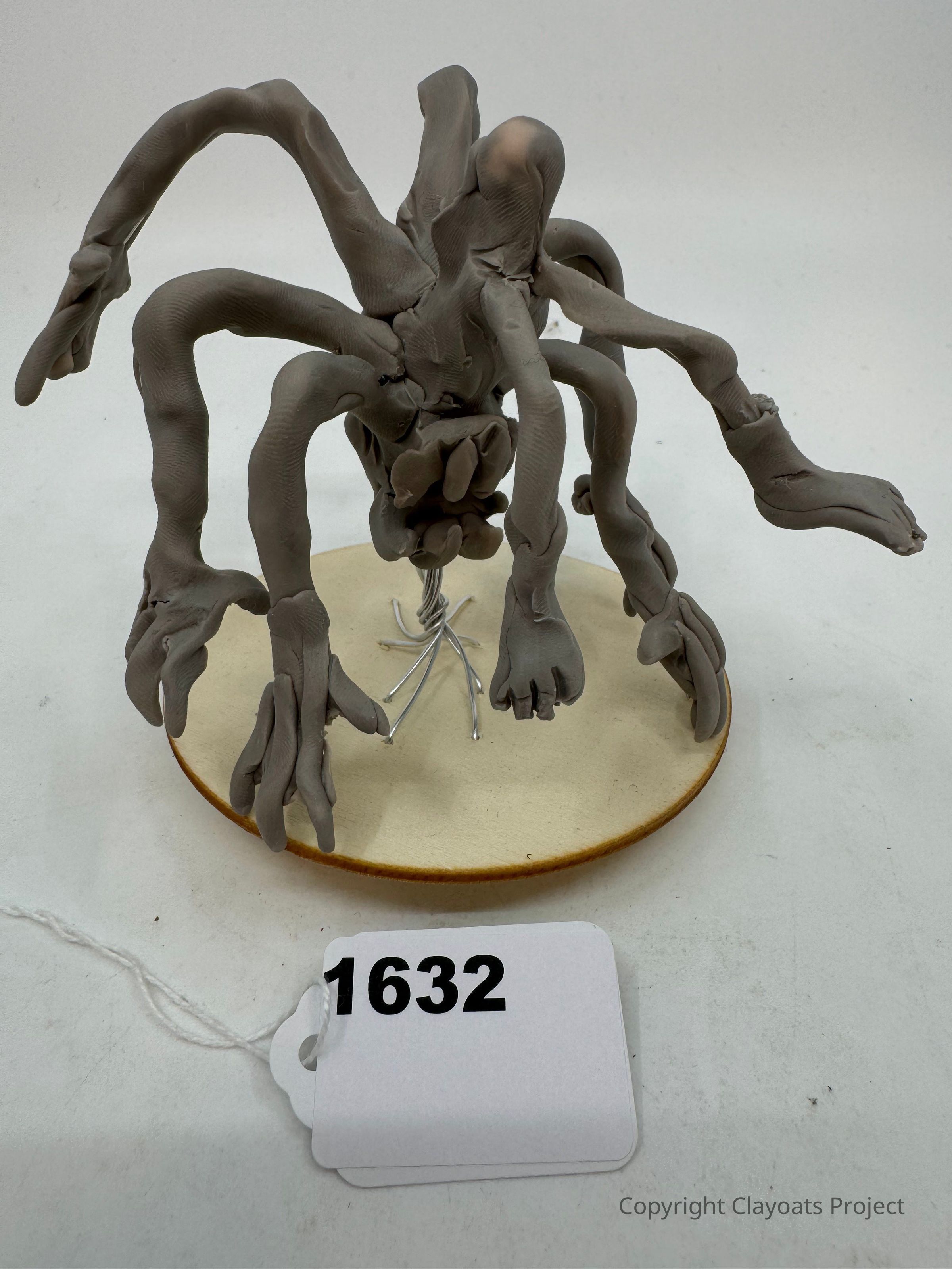 The image showcases a gray clay sculpture with multiple elongated and winding limbs, resembling a creature with tentacle-like appendages. It stands on a round, beige base, supported by a wire structure beneath it. To the bottom right of the image,. The background is a plain white surface, emphasizing the intricate details and unique form of the sculpture. The piece seems to blend organic and abstract design elements, creating an intriguing