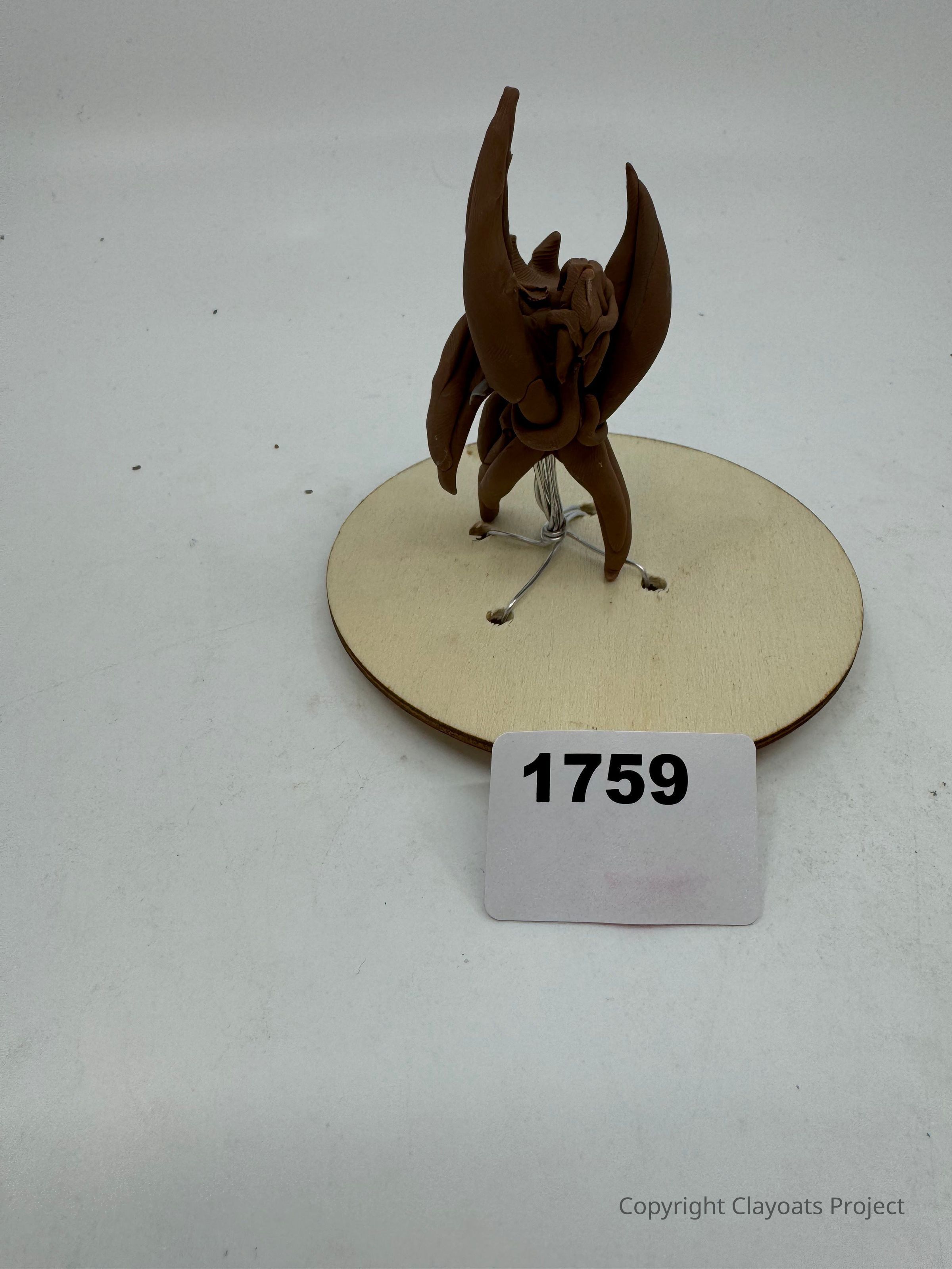 The image depicts a brown, abstract sculpture resembling an insect or creature with pointed wings or limbs placed on a round wooden base. The sculpture is supported by thin wires attached to the base, which is numbered "1759" on a white card positioned at the front. The background is a plain light gray, enhancing the focus on the sculpture's intricate design and unique form. The sculpture's materials and style give it an artistic, handmade appearance, suggesting it might be part of a larger exhibition or a numbered