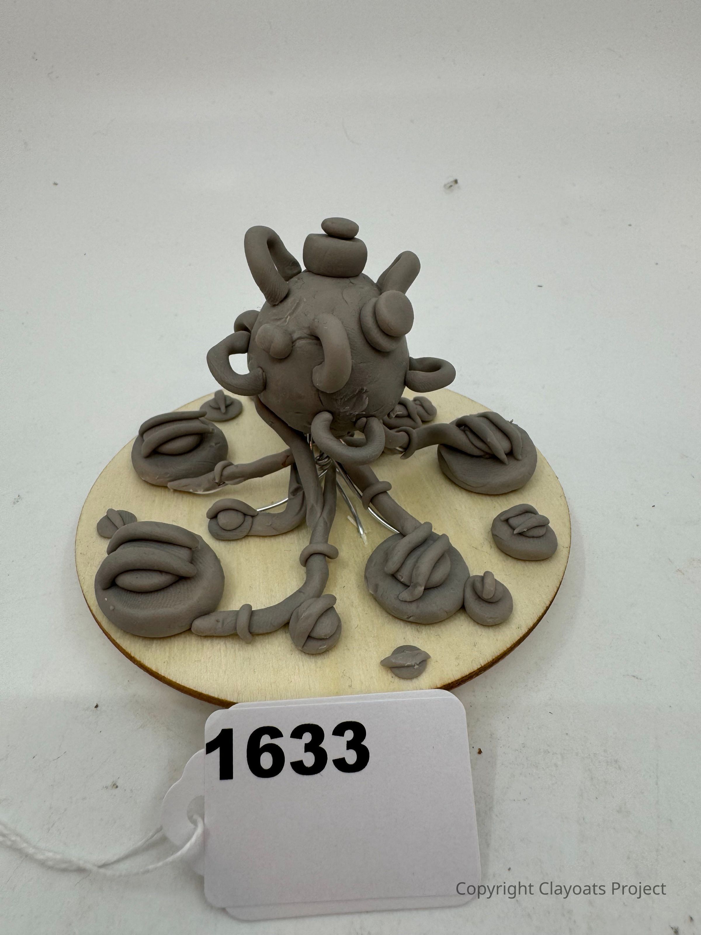 The image features a sculptural clay creation placed on a round wooden base, showcasing an abstract design with a central sphere adorned with multiple protruding appendages and spiral details, resembling tentacles, surrounded by circular formations.