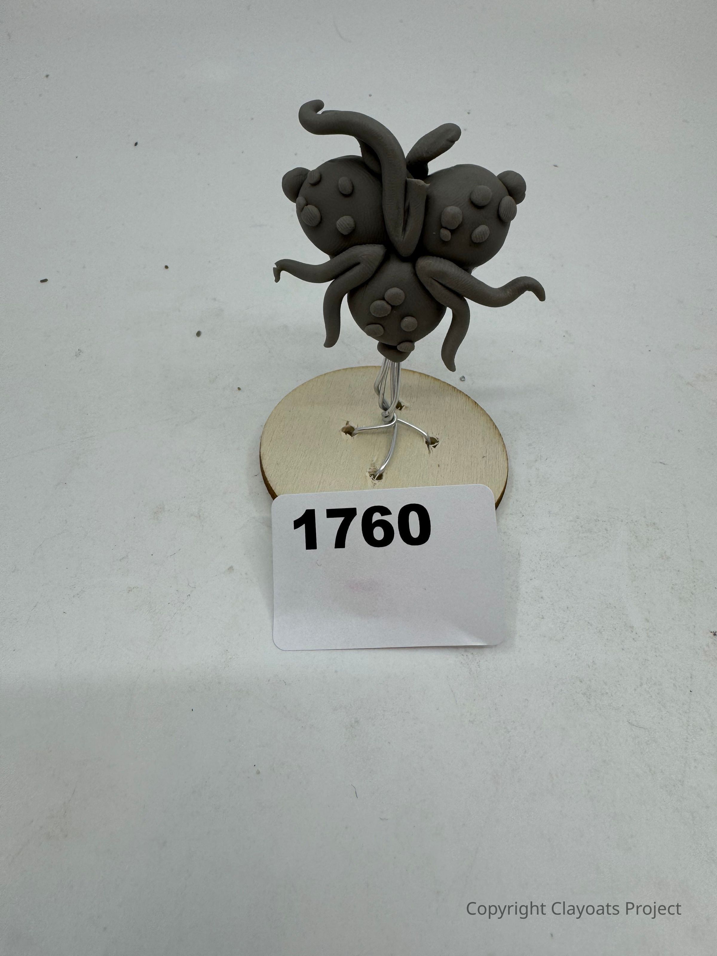 The image depicts a creative sculpture featuring three abstract, spherical forms covered in small circular patterns and interconnected with flowing, tendril-like shapes made from a dark clay material, all mounted on a simple wooden base with a wire support, situated against a plain, light-colored background.