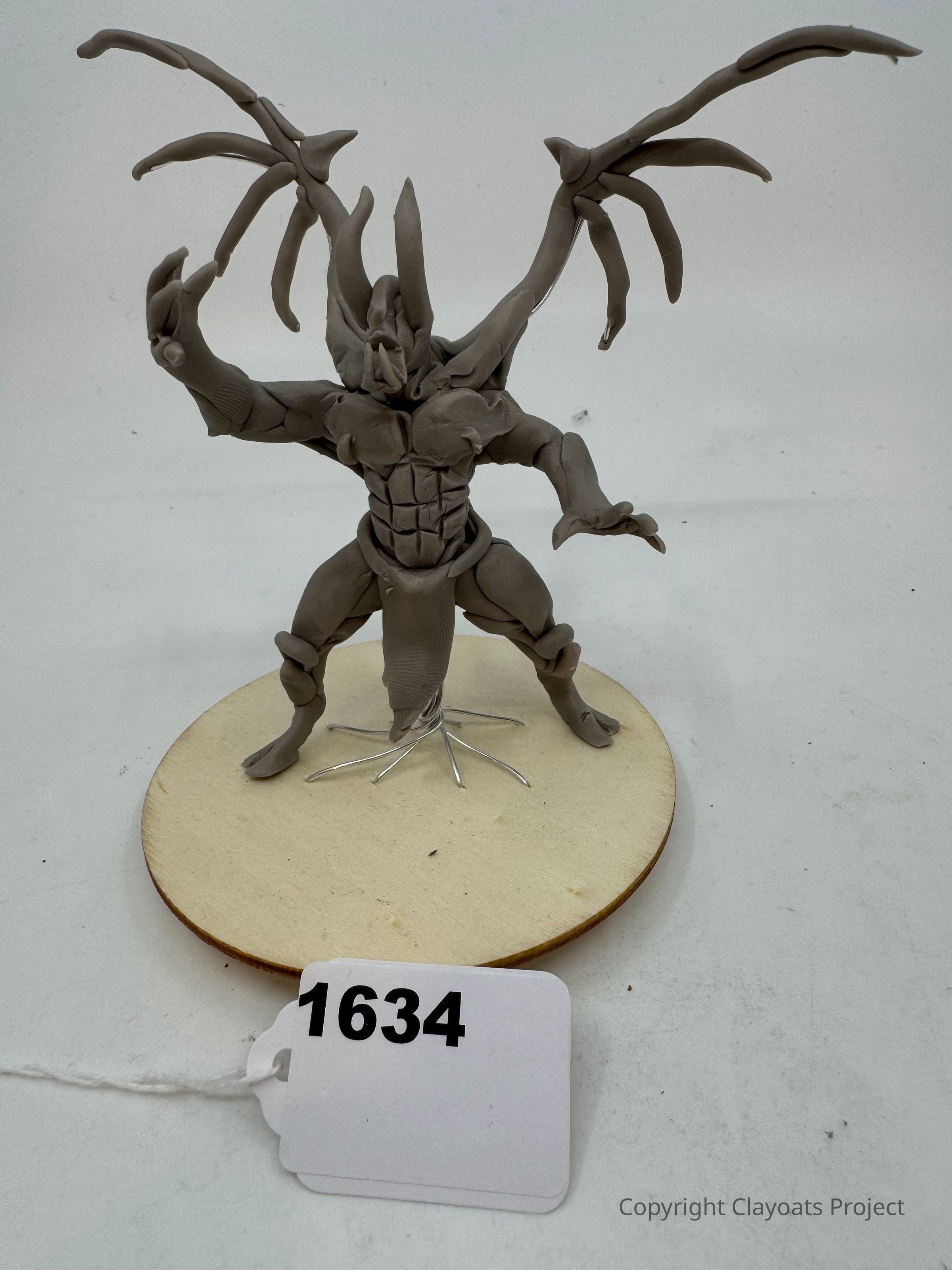 The image shows a detailed sculpture of a muscular, mythical creature with four large, horn-like appendages extending from its back, standing on a round wooden base. The creature has pronounced facial features, a well-defined torso with visible muscles, and is posed with its arms extended, giving it an imposing stance. Made from gray modeling material, its surface texture is smooth yet intricately crafted to highlight various anatomical details. Below the sculpture.