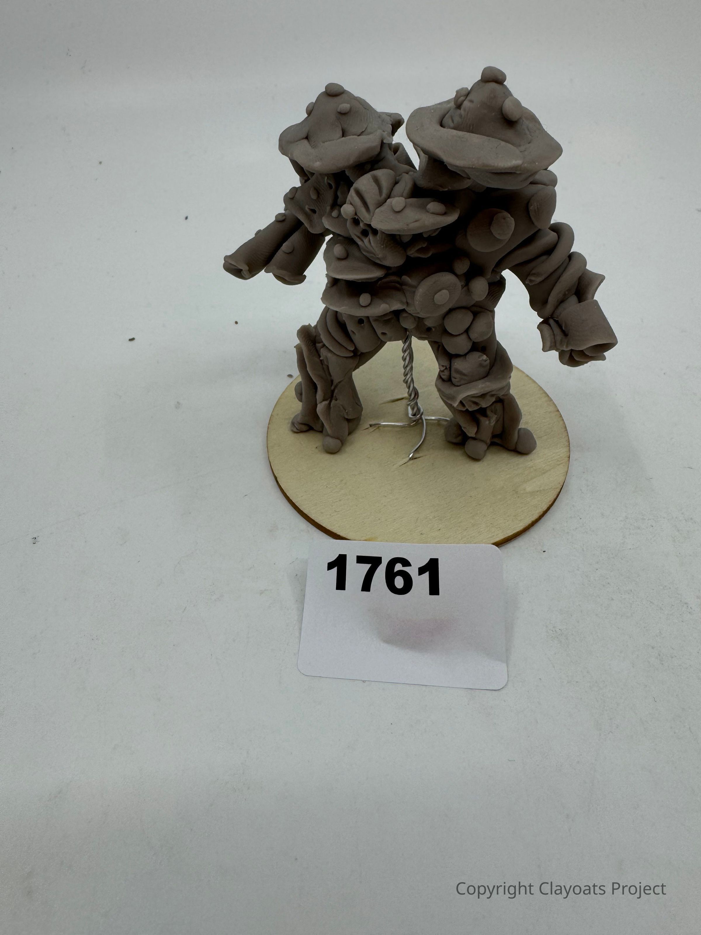 The image depicts a unique, intricate clay sculpture with an abstract design featuring various protruding shapes and circular elements, reminiscent of mushrooms or surreal armor. It is positioned on a round wooden base and supported by a twisted metal wire, giving it stability. The sculpture appears to be made from a single piece of clay, lacking distinct facial features or recognizable forms, yet exhibiting a dynamic and imaginative composition.