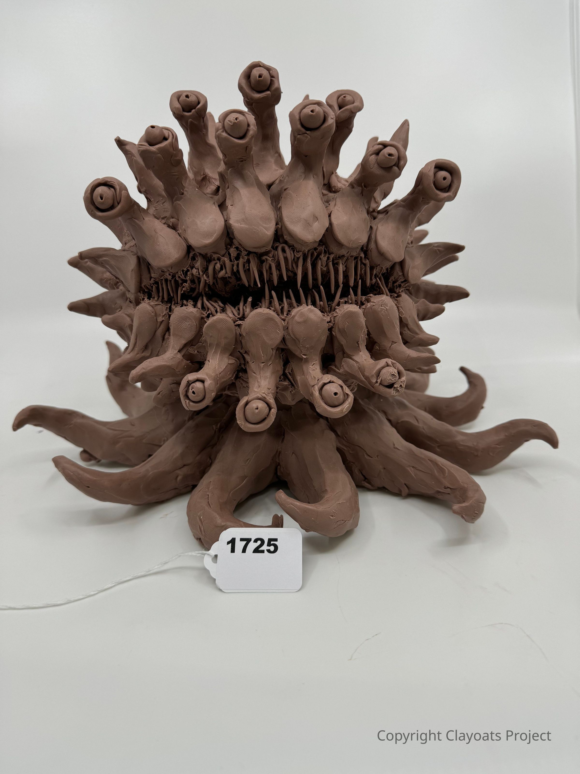 A complex array of organic, tentacle-like appendages radiating from a central body. Each of the appendages has an eye-like detail at its tip, contributing to an overall alien and surreal appearance. The surface texture varies between smooth and finely detailed, adding depth and intricacy to the piece.