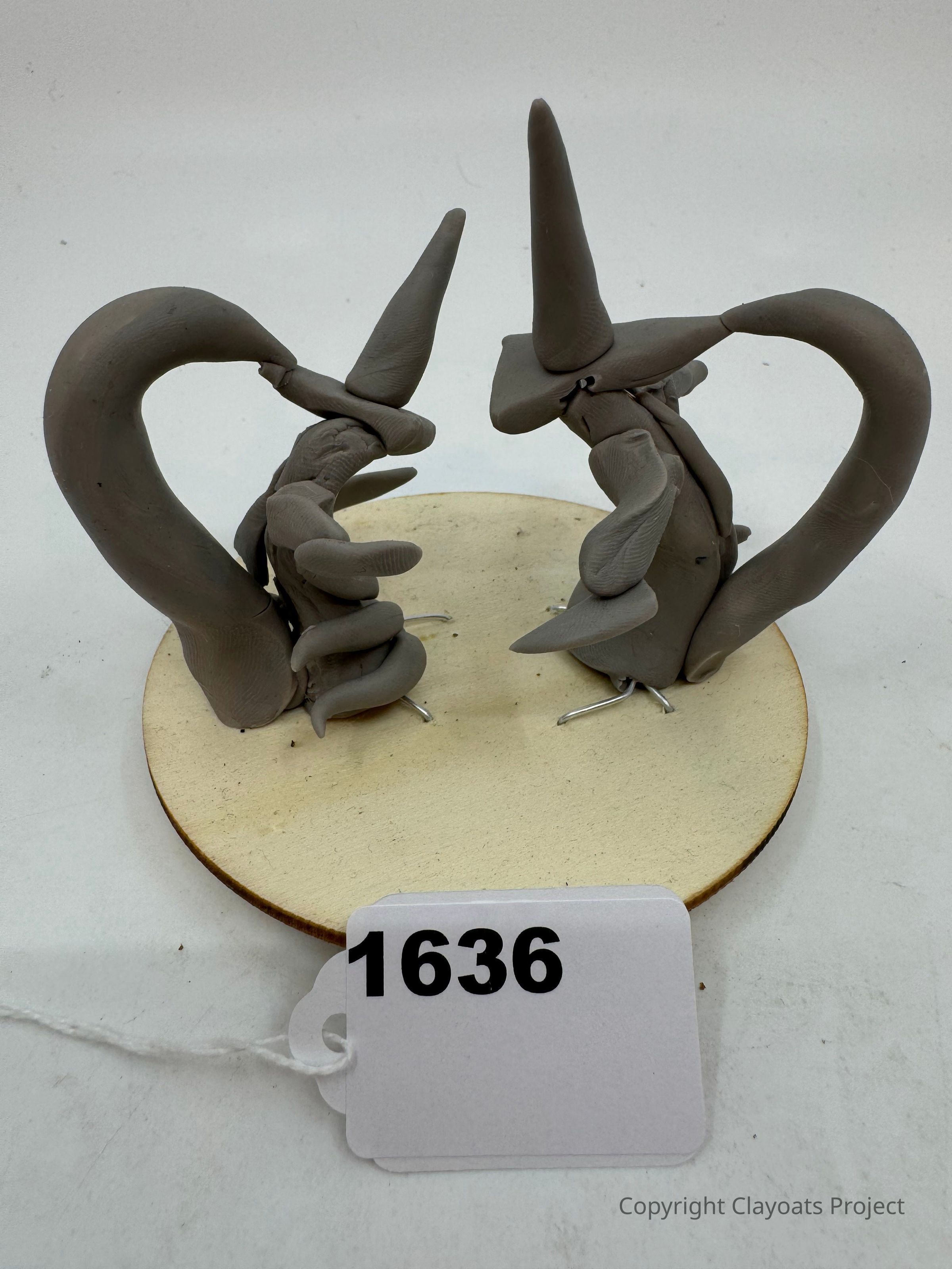 The image depicts two abstract clay sculptures positioned on a circular wooden base, each with elongated, curved shapes and pointy sections that give them a whimsical appearance, possibly resembling creatures or figures with exaggerated features. These sculptures, which appear thoughtfully crafted, are firmly attached to the base with metal supports that are visible underneath. The overall composition is intriguing and artistic, reflecting creativity in form and material.