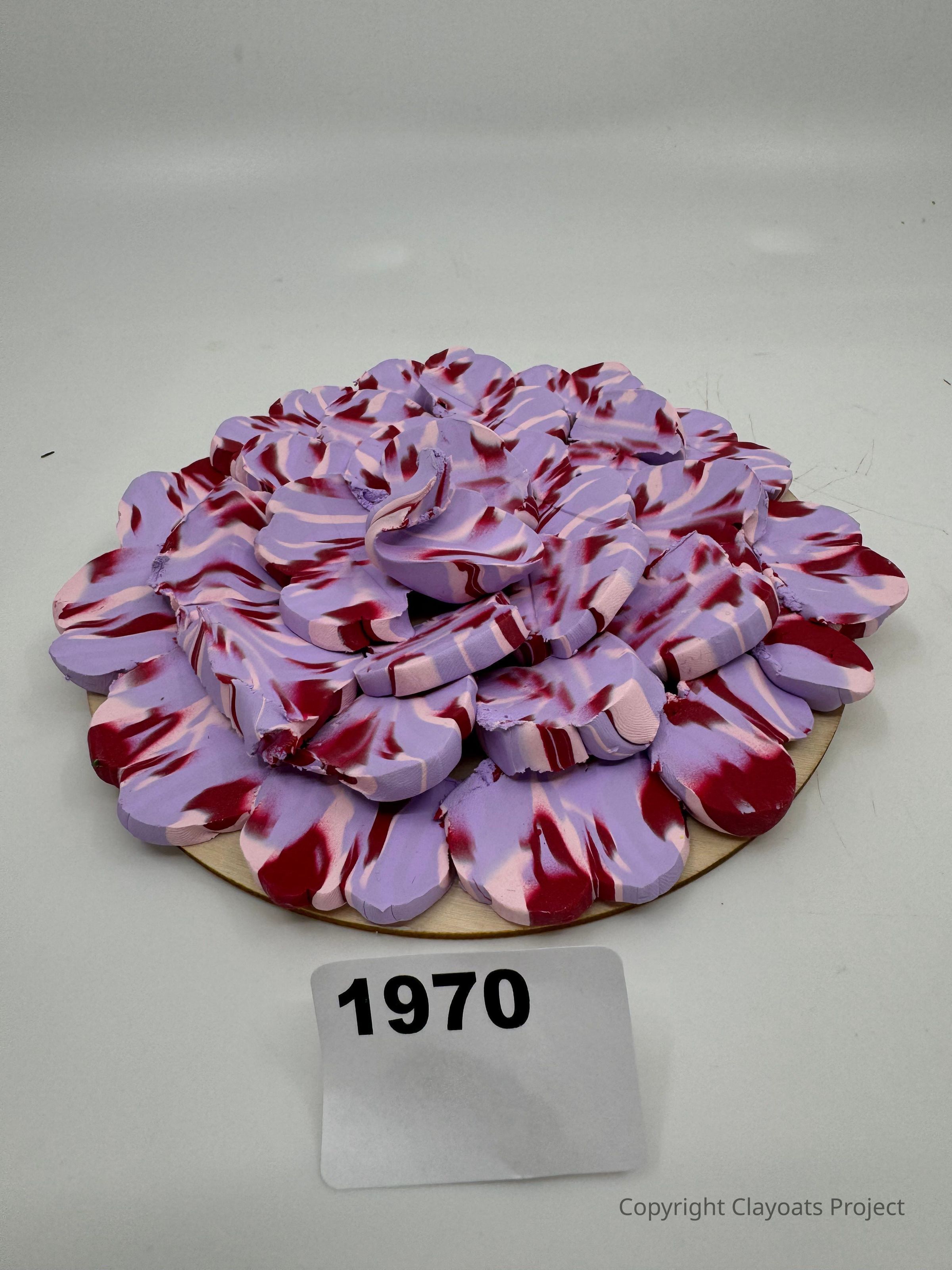 The image shows a circular arrangement of colorful clay pieces on a flat surface. Each piece is a mix of lavender and maroon swirls, resembling petals or abstract shapes, arranged in a layered, overlapping pattern. The overall design has a floral or decorative appearance, with the swirling colors creating a dynamic and vibrant effect.