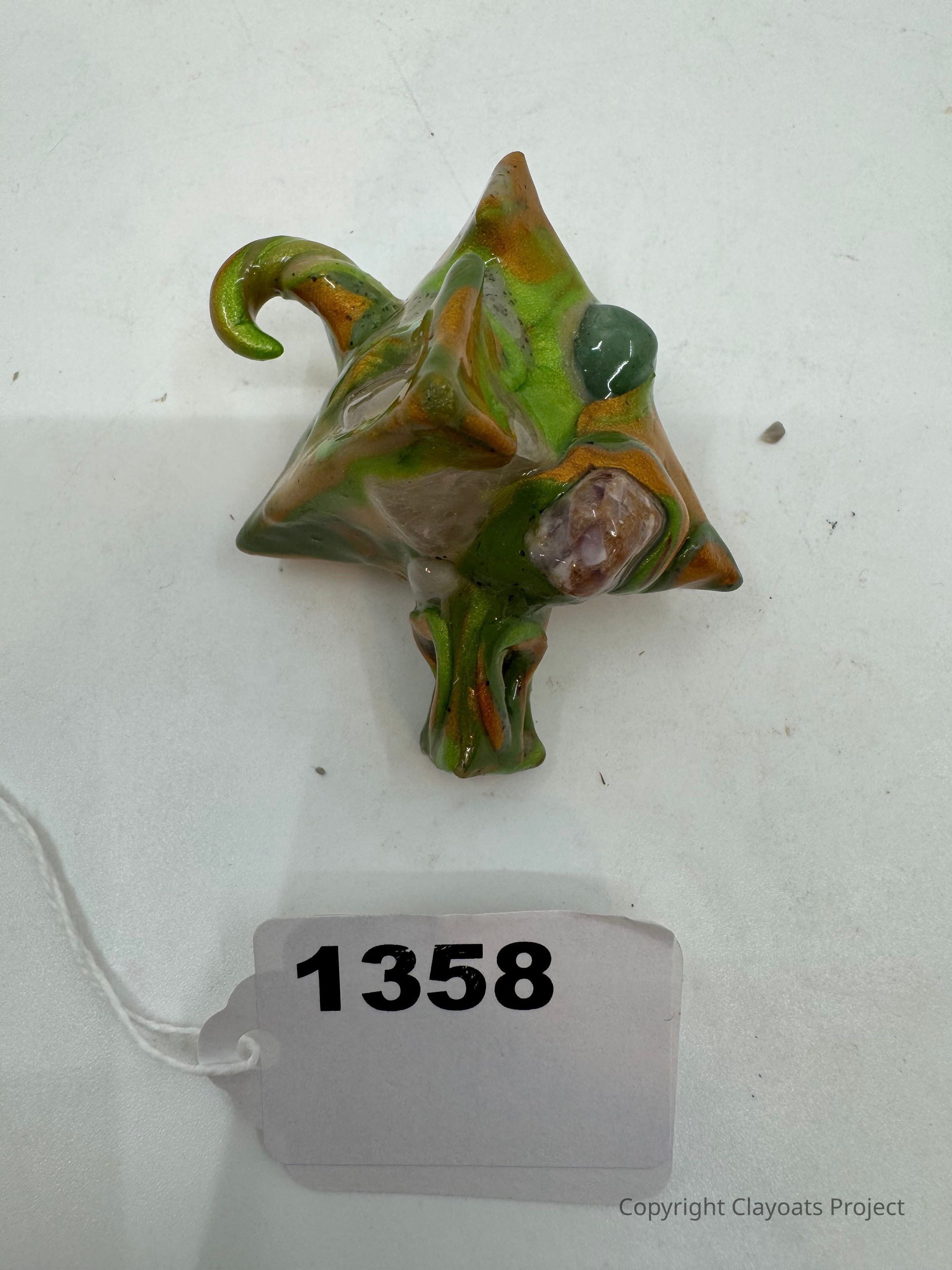 The image displays a small, uniquely shaped sculpture with a glossy, multicolored finish, predominantly green and brown, featuring intricate curves and textures.