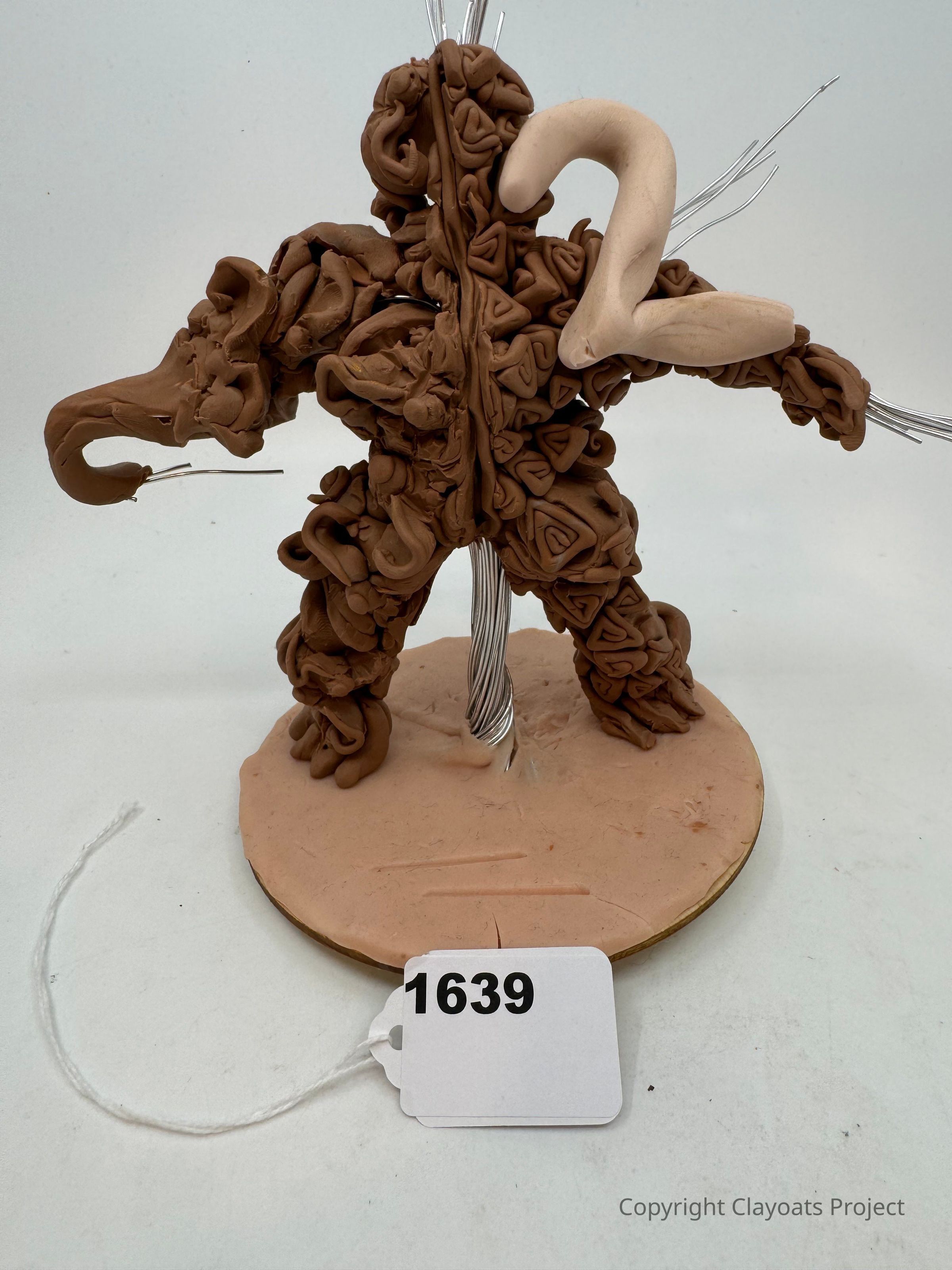 The image features a creatively crafted sculpture of a woolly mammoth made from brown clay, with intricate detailing to represent its fur, mounted on a circular base. The sculpture shows the mammoth's distinct tusks and trunk, and has a wire framework visible in some areas. The base is a light beige color, The overall composition sits against a plain white background, highlighting the artisan's skill in bringing the