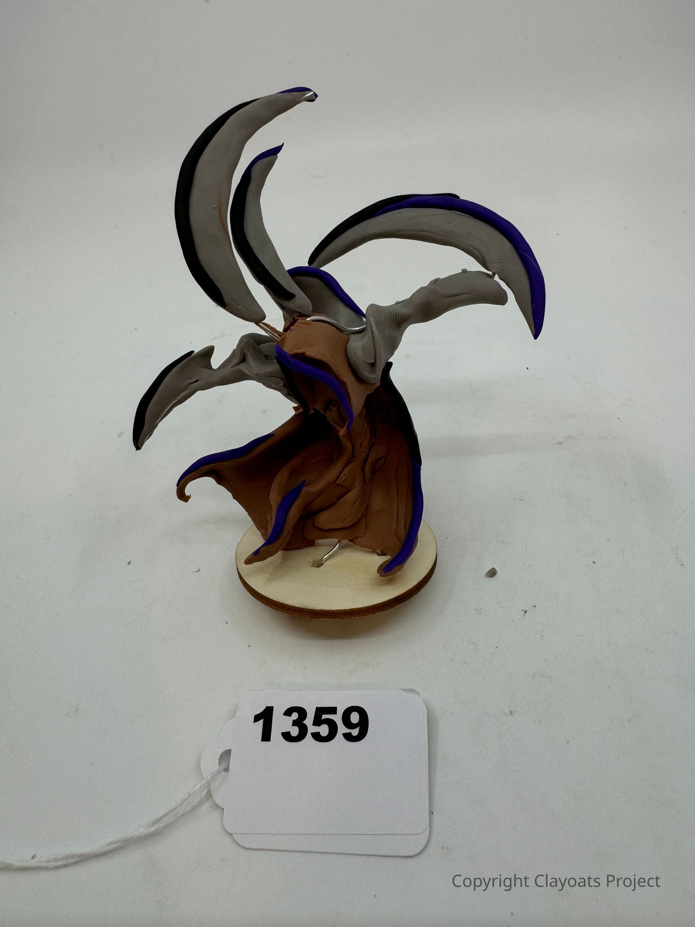The image shows a unique sculpture featuring several twisting, elongated forms that resemble tentacles or abstract blades, crafted from materials that appear to be clay, with shades of black, gray, and brown accented by bold purple edges; it rests on a circular wooden base, all set against a plain white background that accentuates the intricate and dynamic design of the sculpture.
