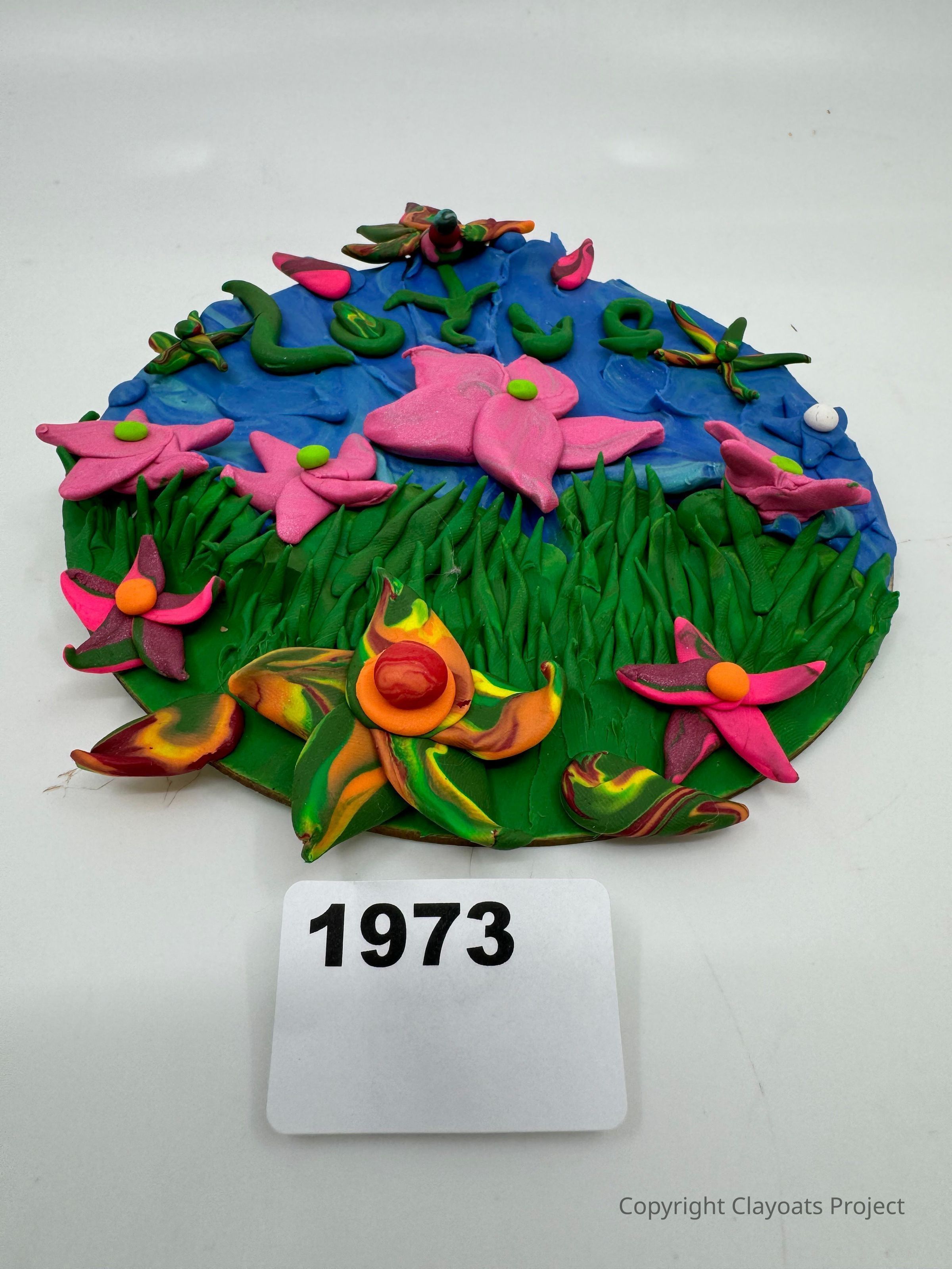 The image displays a vibrant, round clay sculpture depicting a garden scene with various colored flowers, including pink and orange blossoms, set against a background of blue sky and green grass. Several abstract floral shapes and small plant-like figures are artistically arranged on top, creating a dynamic, colorful compositional . The overall aesthetic is playful and creative, with a focus