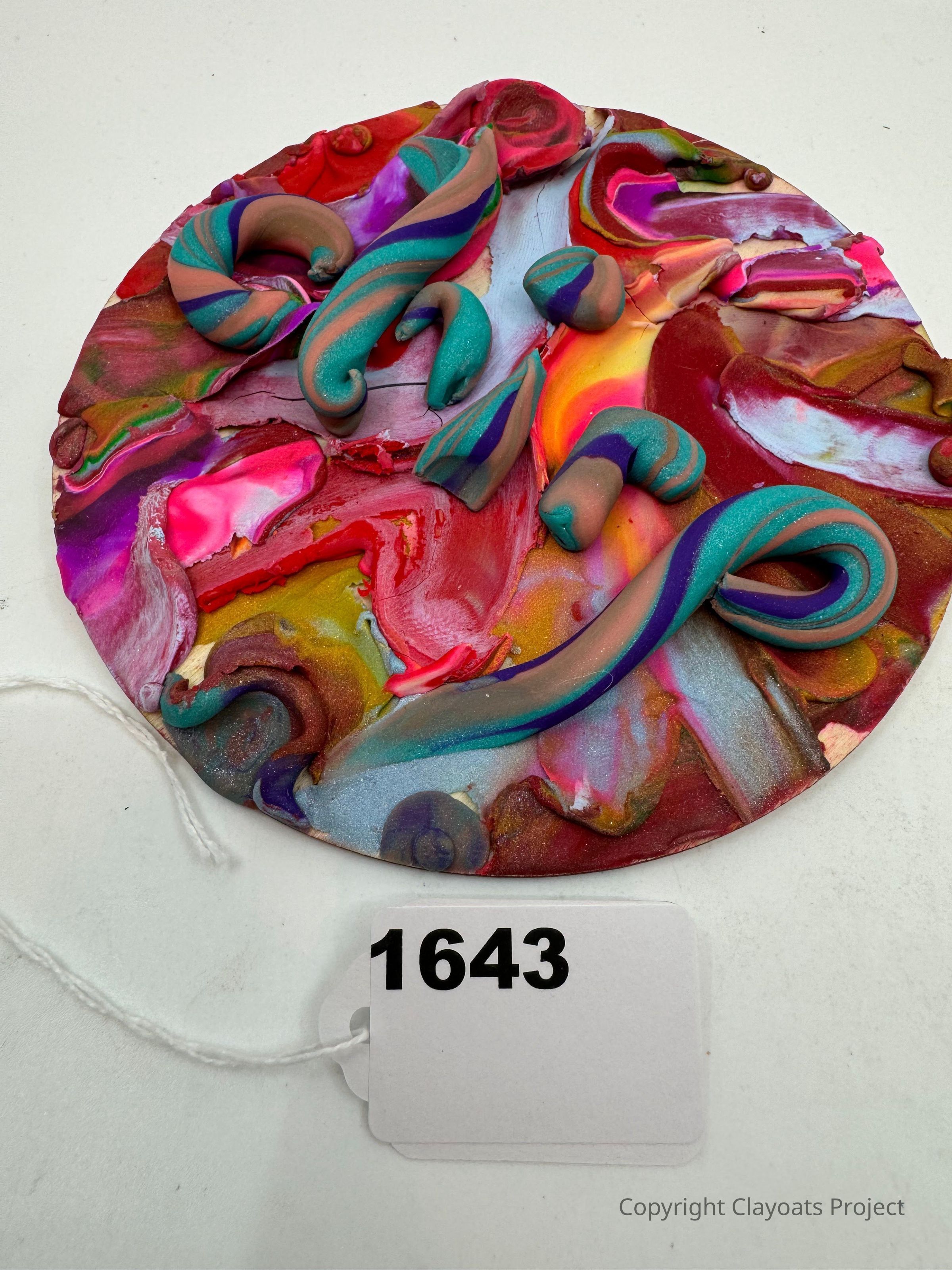 The image displays a circular, colorful, abstract artwork featuring swirling, textured shapes in vibrant hues of red, pink, orange, purple, and teal. The intricate design appears to include raised elements that add depth and dimension, creating a dynamic visual experience. These elements are enhanced by a mix of smooth and rough textures, contributing to the piece’s tactile appeal.