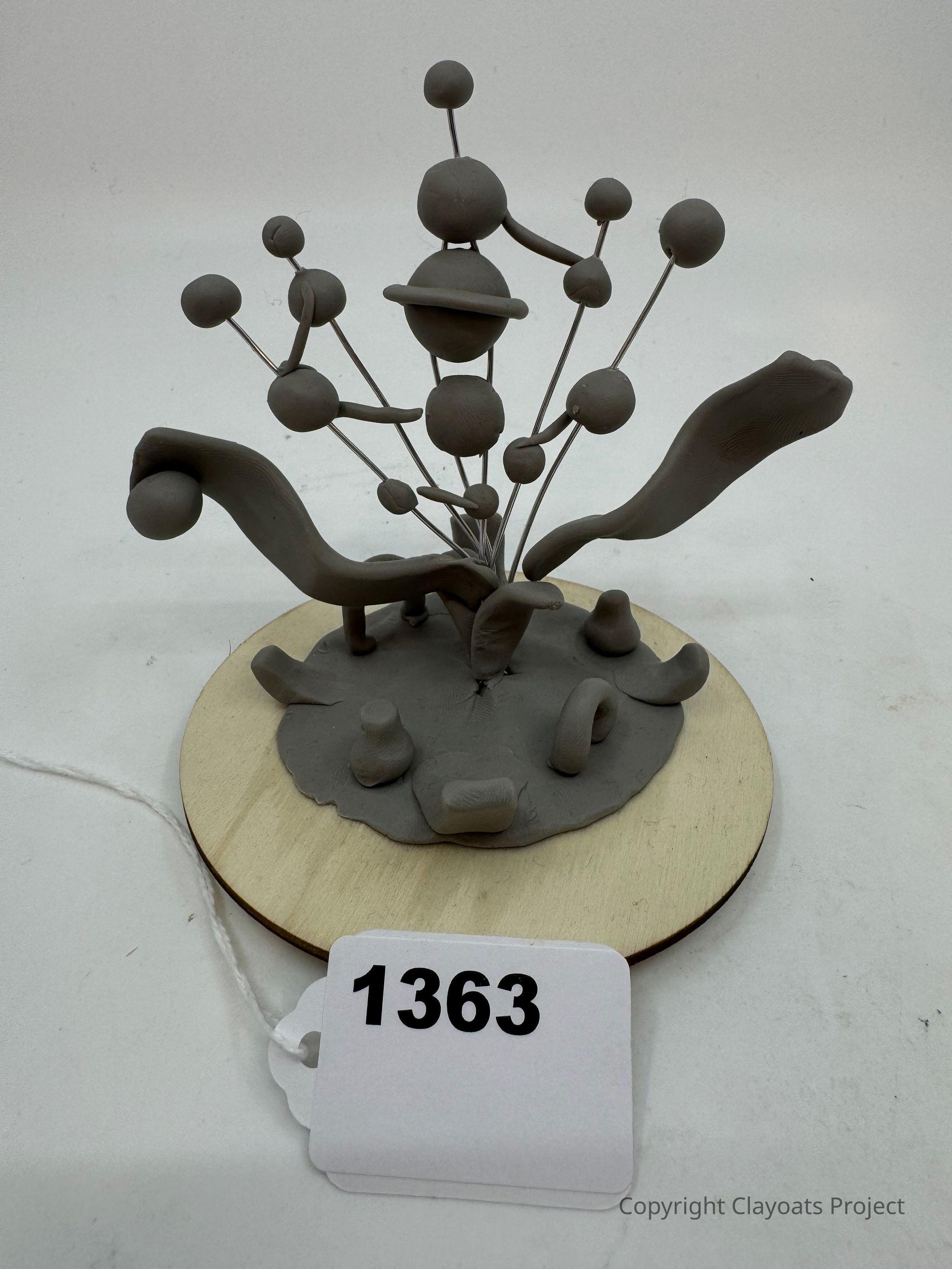 The image shows a creative clay sculpture featuring a central structure with various spherical shapes connected by thin rods, resembling an abstract molecular or botanical form, all mounted on a round wooden base.
