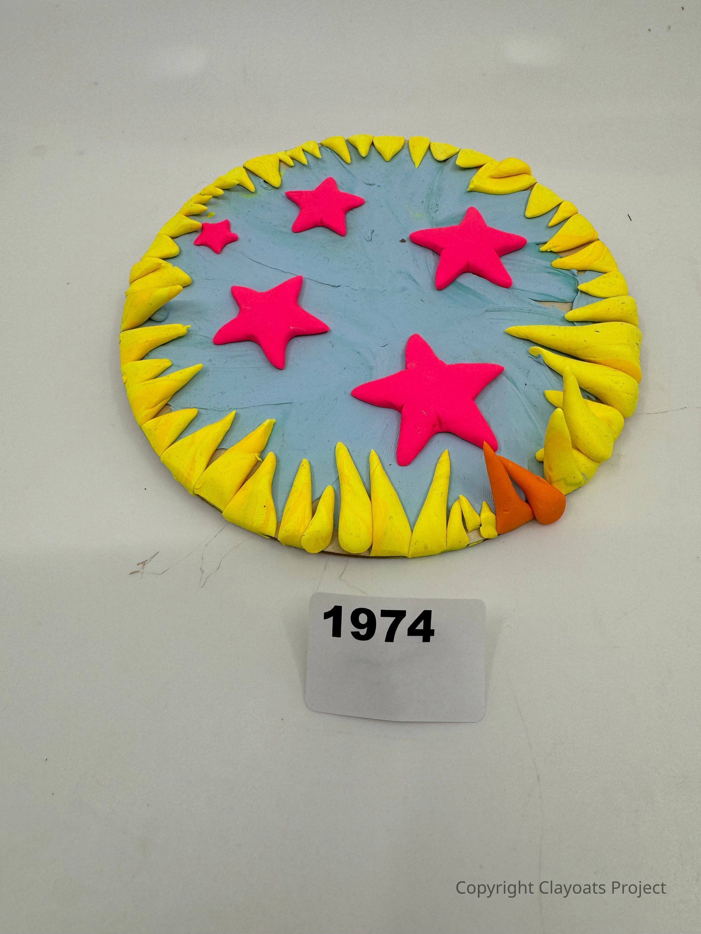 The image displays a circular clay creation with a blue base, surrounded by a sunburst pattern made from yellow clay around the edges. Bright pink stars, in varying sizes, are scattered across the blue surface. The texture appears smooth but slightly streaked, giving a handmade appearance.