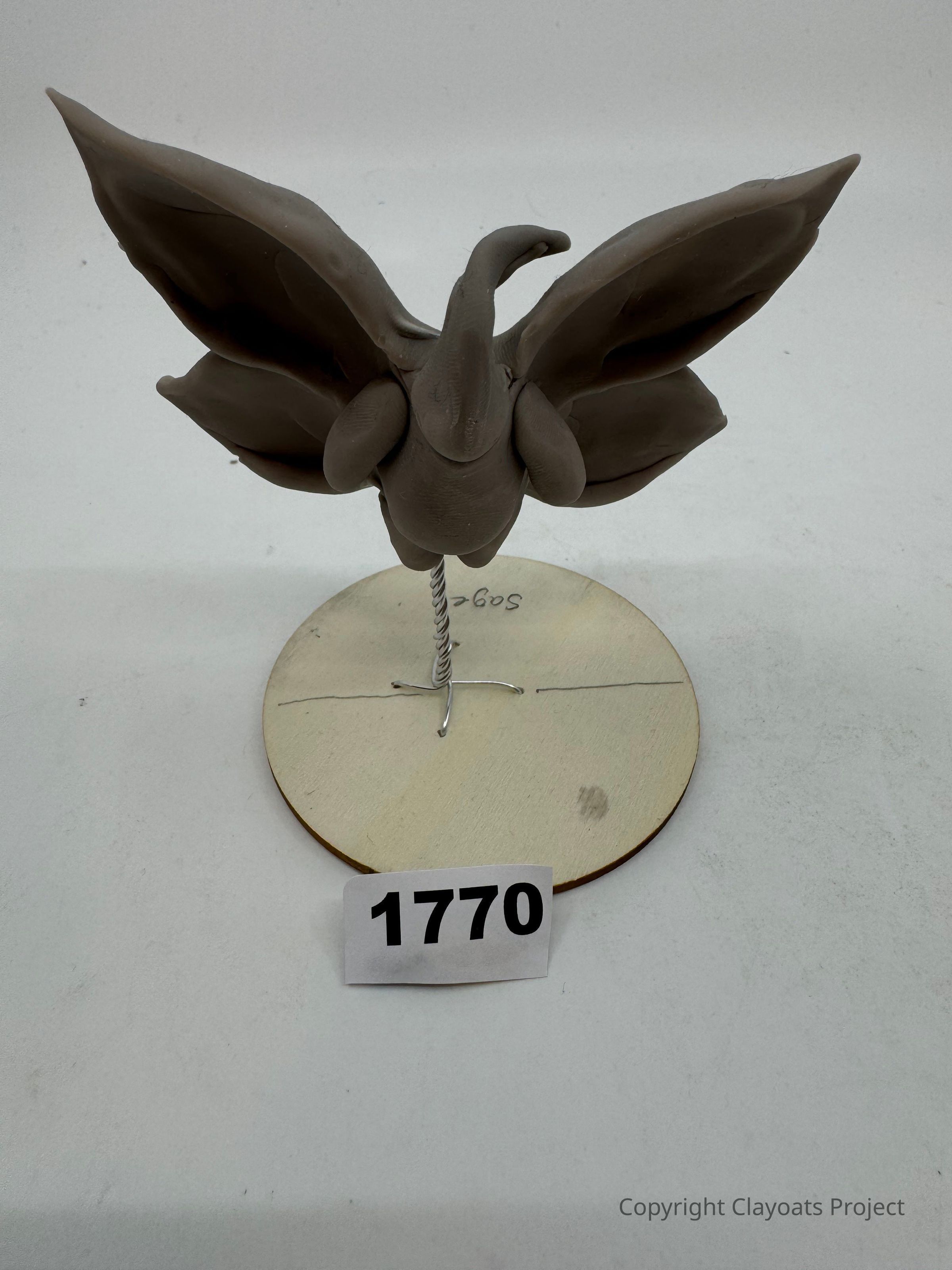 The image depicts a clay sculpture of a bird-like figure with large, stylized wings spread wide, mounted on a circular base with a wire support, all set against a plain white background.