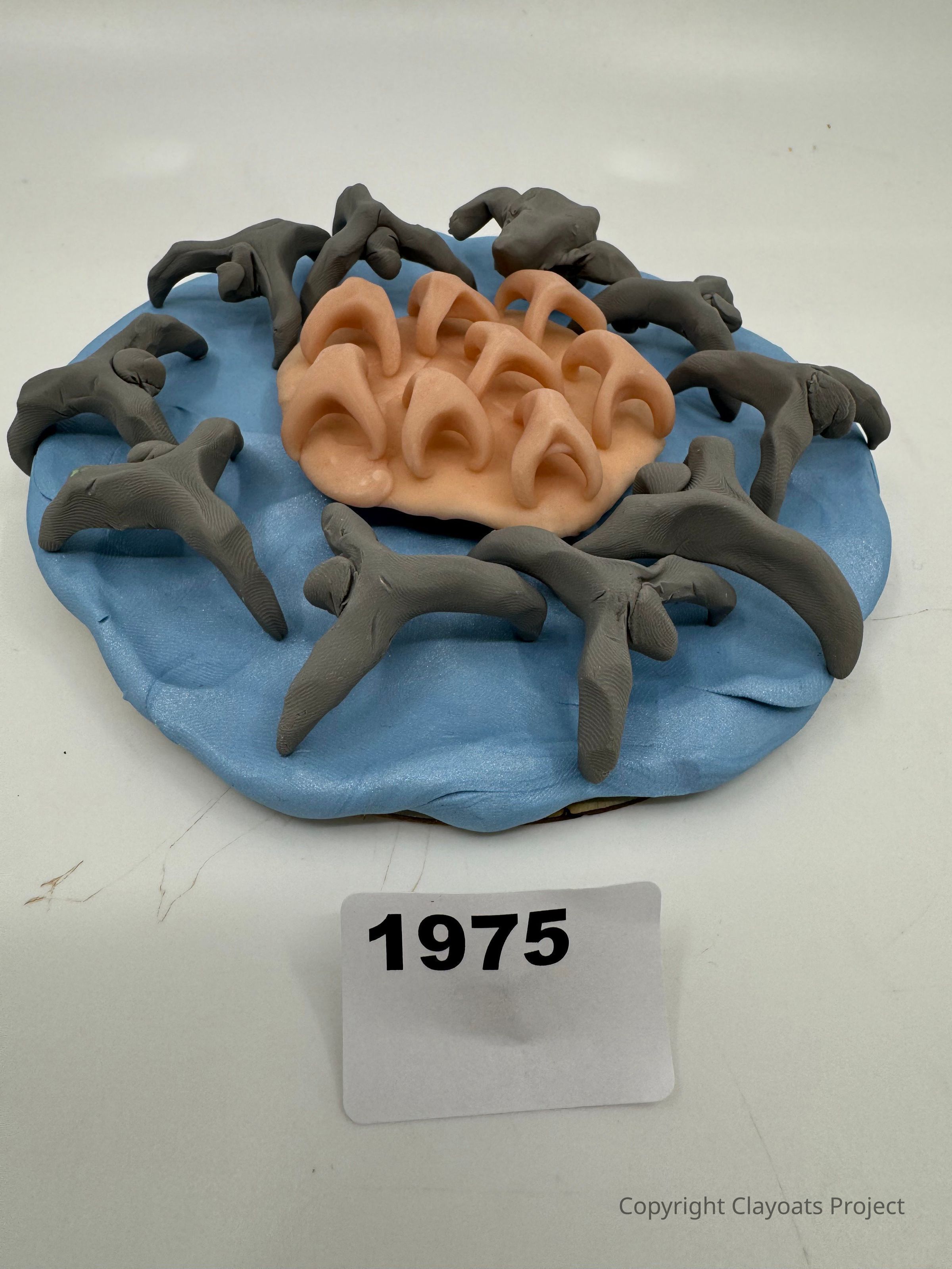 The image displays a clay model featuring a central pink structure with arch-like formations surrounded by gray, branch-like figures on a blue circular base.