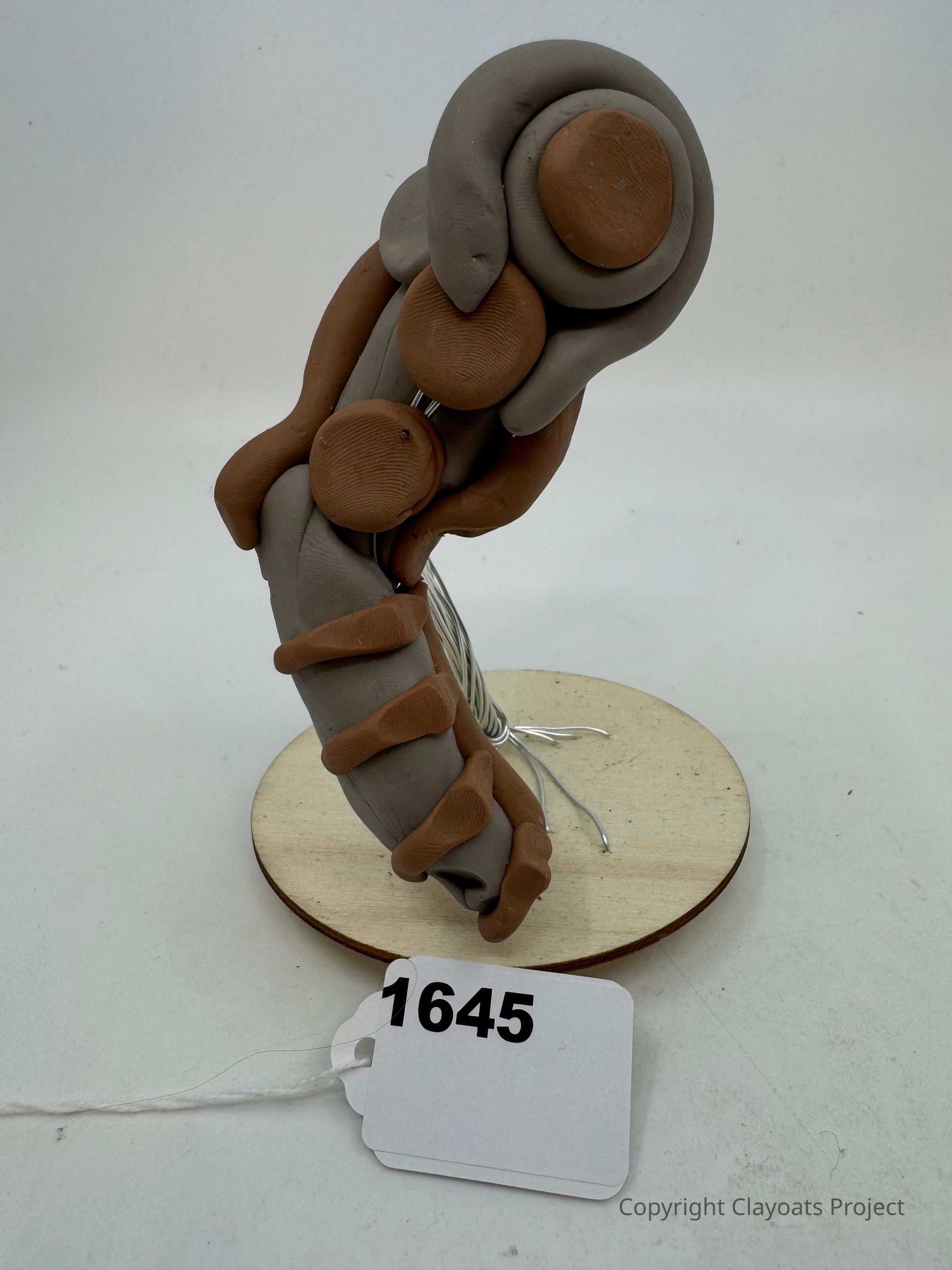 The image depicts a sculpted object made of clay in shades of gray and brown, resembling an abstract, organic shape with curved, layered elements attached to a wire stand, resting on a circular wooden base. The background is a plain, light surface, providing a neutral setting that emphasizes the details and texture of the clay sculpture, which showcases the interplay between smooth and textured areas