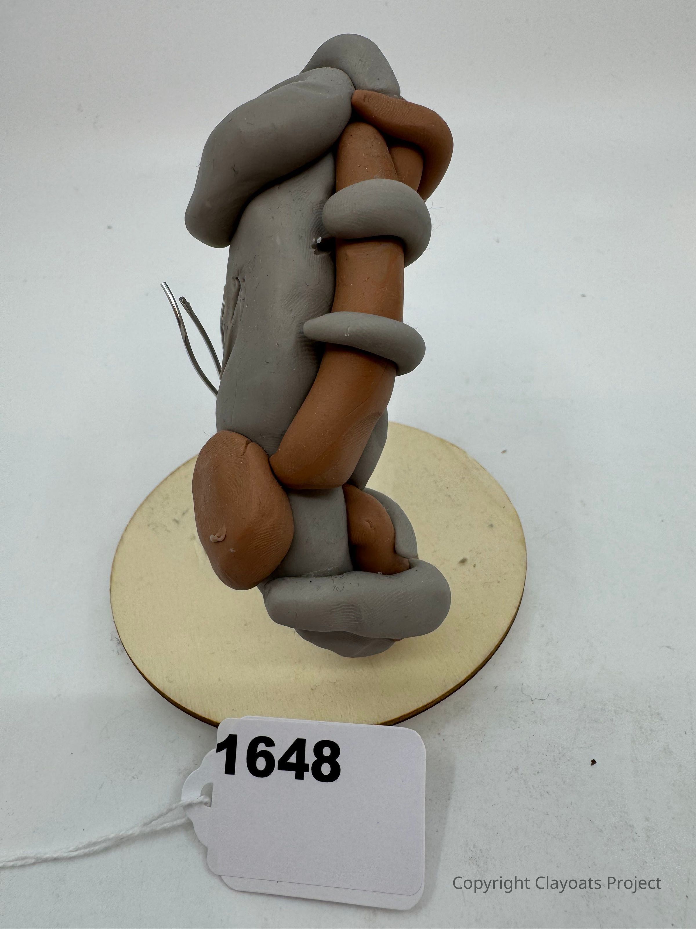 The image shows a sculpted figure made of clay in various shades of gray and brown, featuring intertwining shapes and spiral elements, positioned vertically on a circular flat base, , placed on a plain background, suggesting it might be part of an art exhibit or collection.