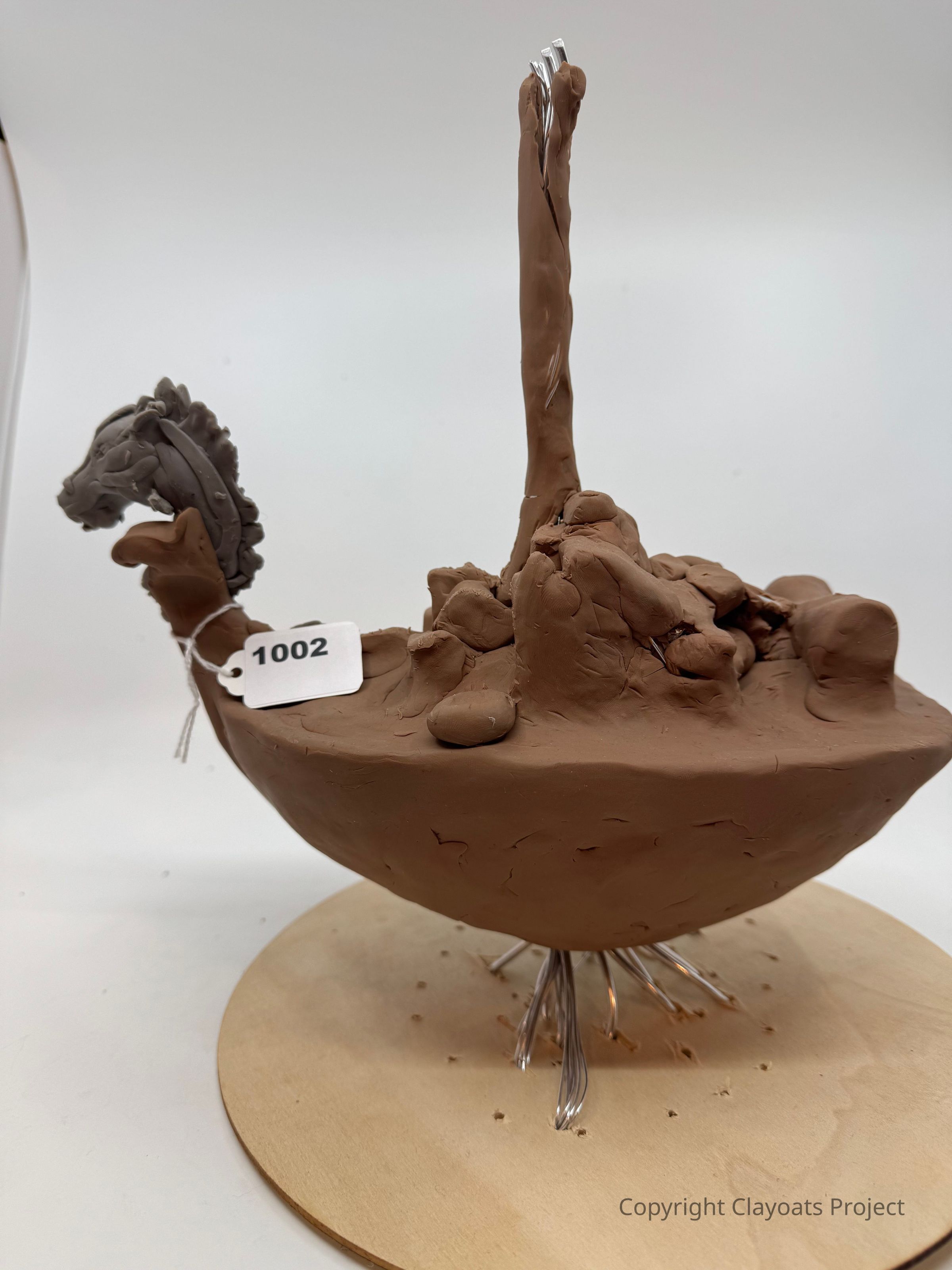 The image features a sculptural creation made from a brown clay-like material, mounted on a wooden base; it possesses a distinct shape resembling a boat with a crafted animal head at the bow, while a tall, slender tower rises from the center, showing intricate detailing; the sculpture is supported by metal wires arranged like roots or legs, contributing to its stability and aesthetic.
